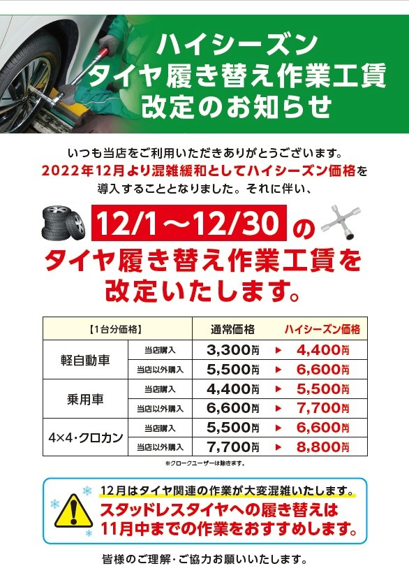 ハイシーズン タイヤ履き替え作業工賃(夏タイヤと冬タイヤの脱着作業工賃) 改定のお知らせ