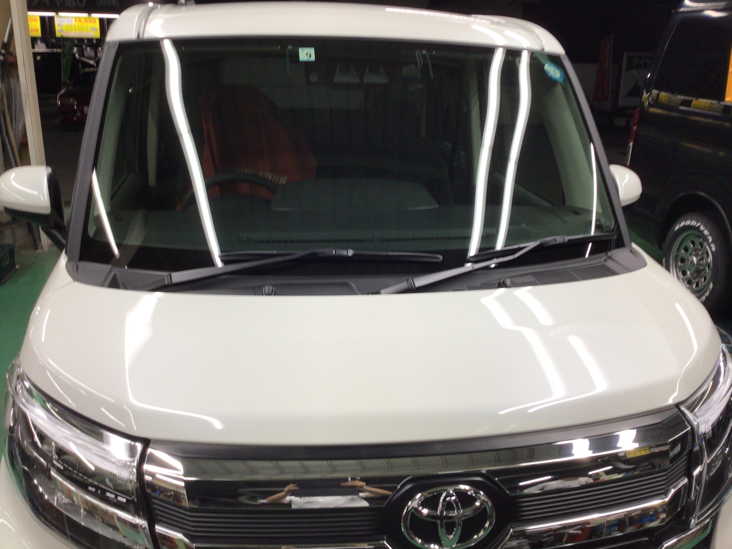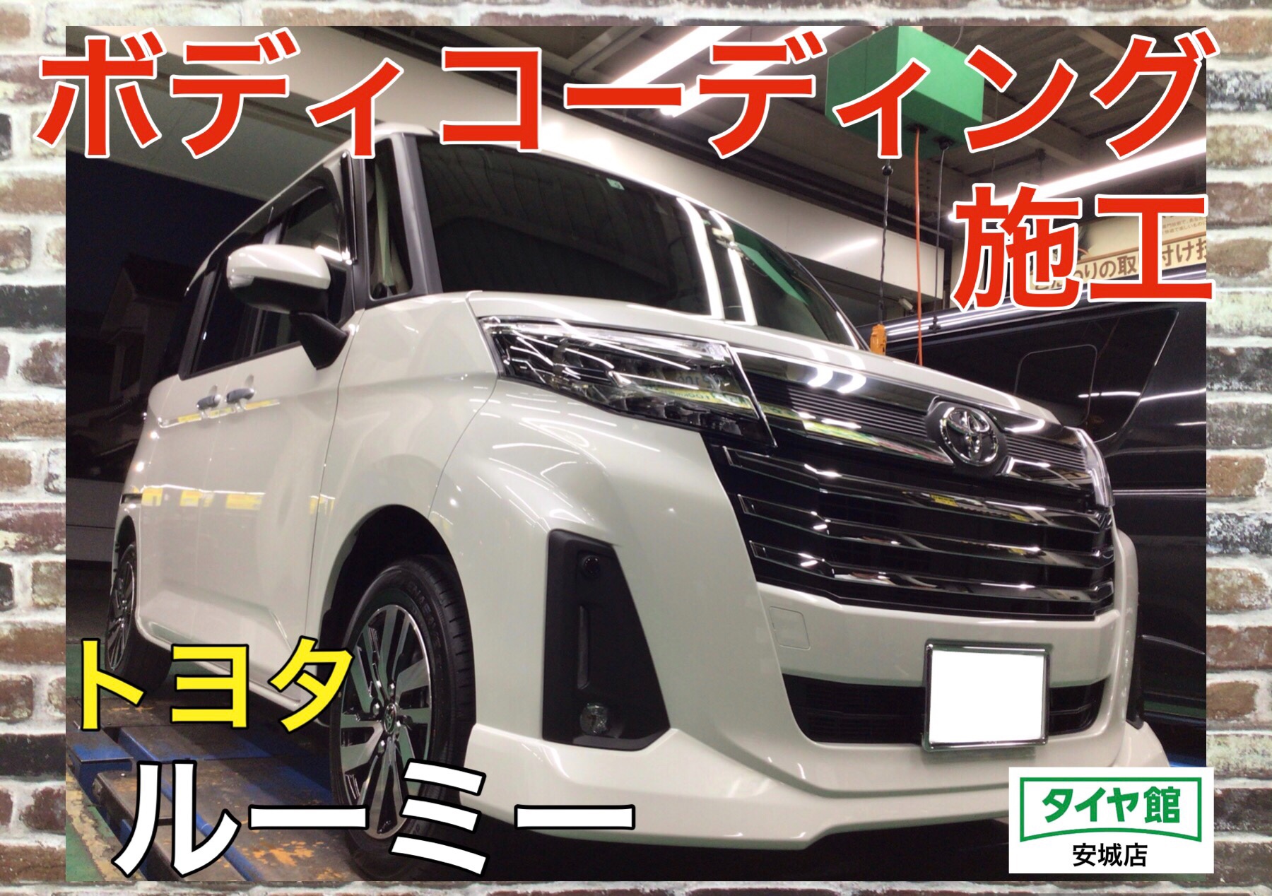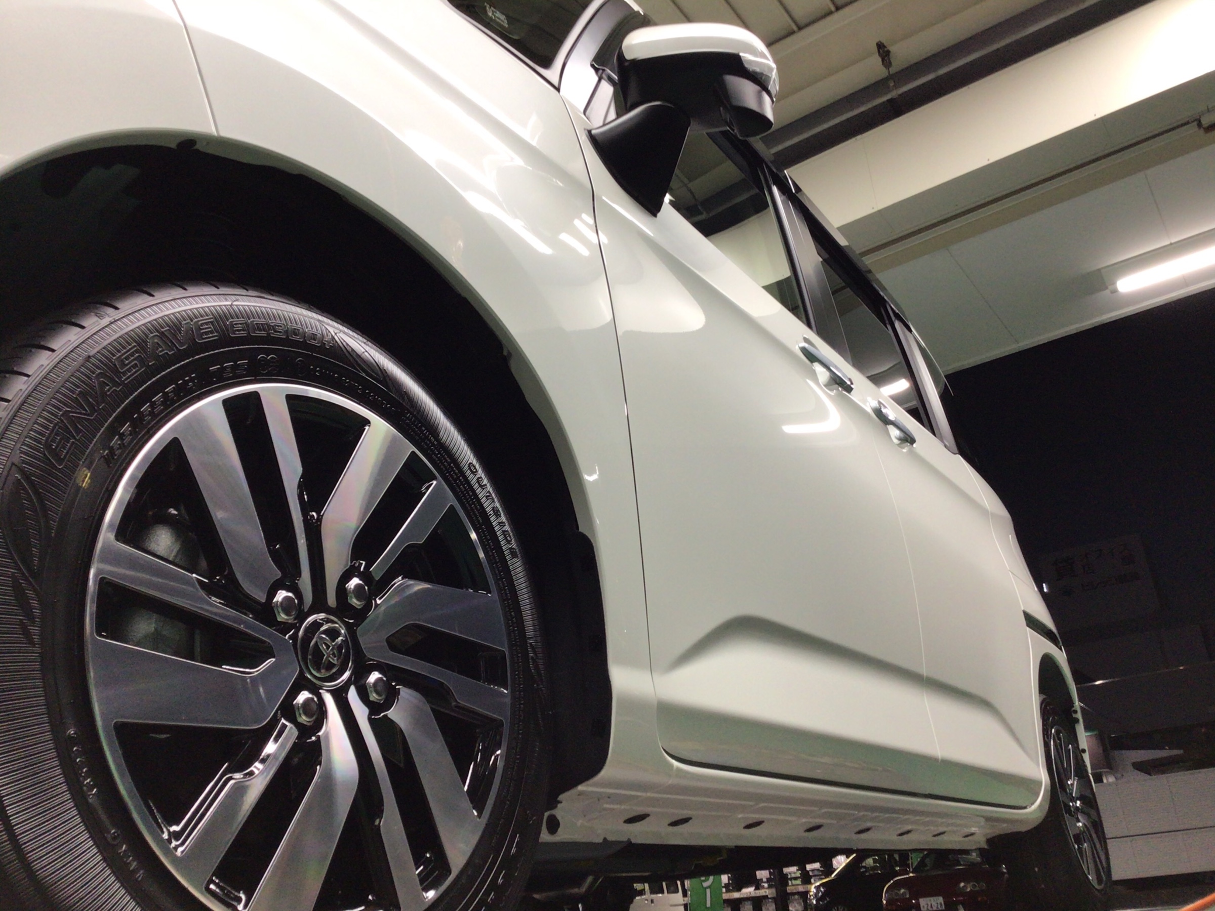 新車で納車まもないルーミーのボディをガラスコーティングで汚れの付きにくく、キレイでいい状態をキープできるコーティング施工をさせていただきました。このボディコーティングは提携先のコーティング屋さんの職人さんが来店しタイヤ館安城店で作業をするという流れです。