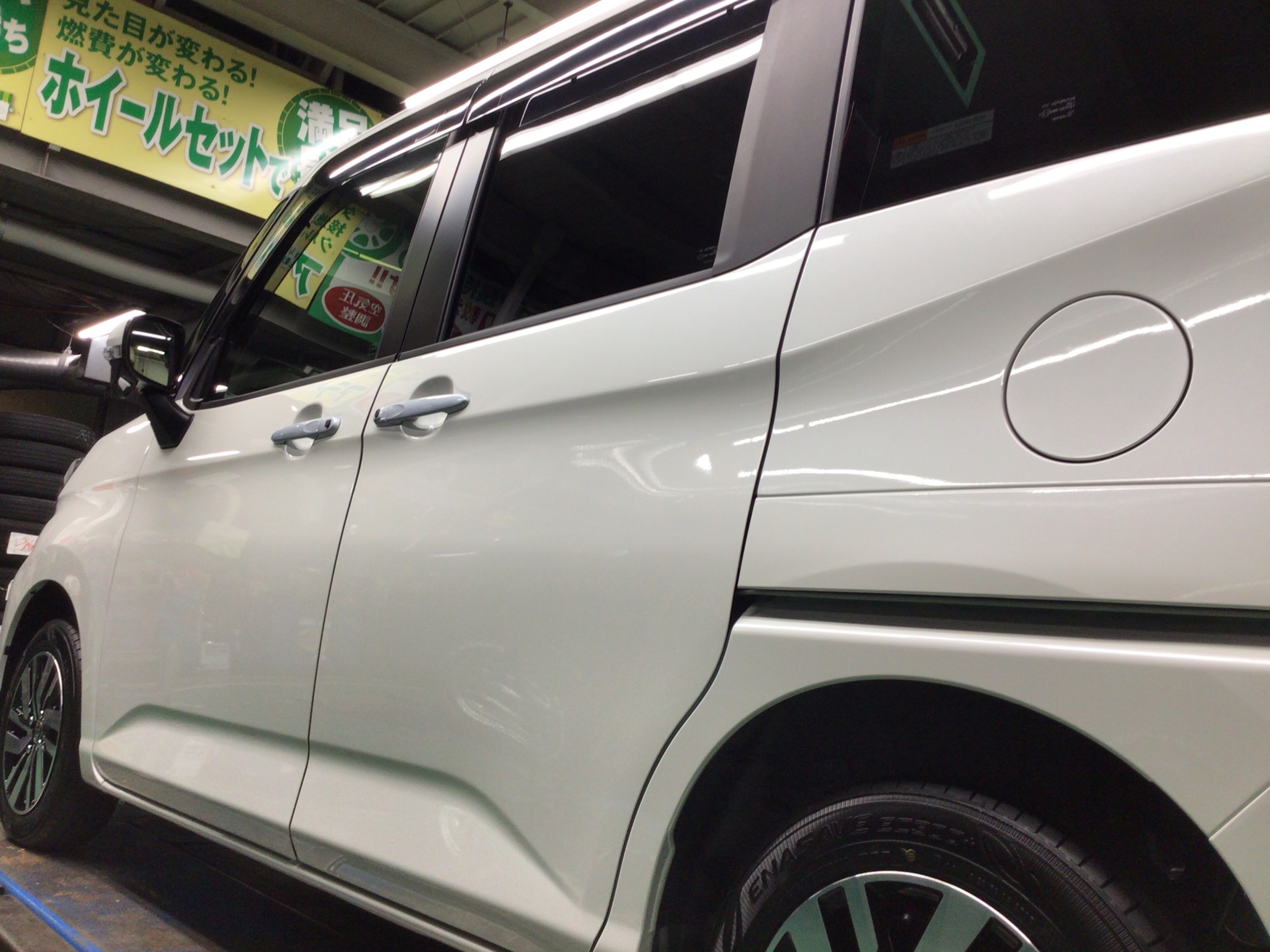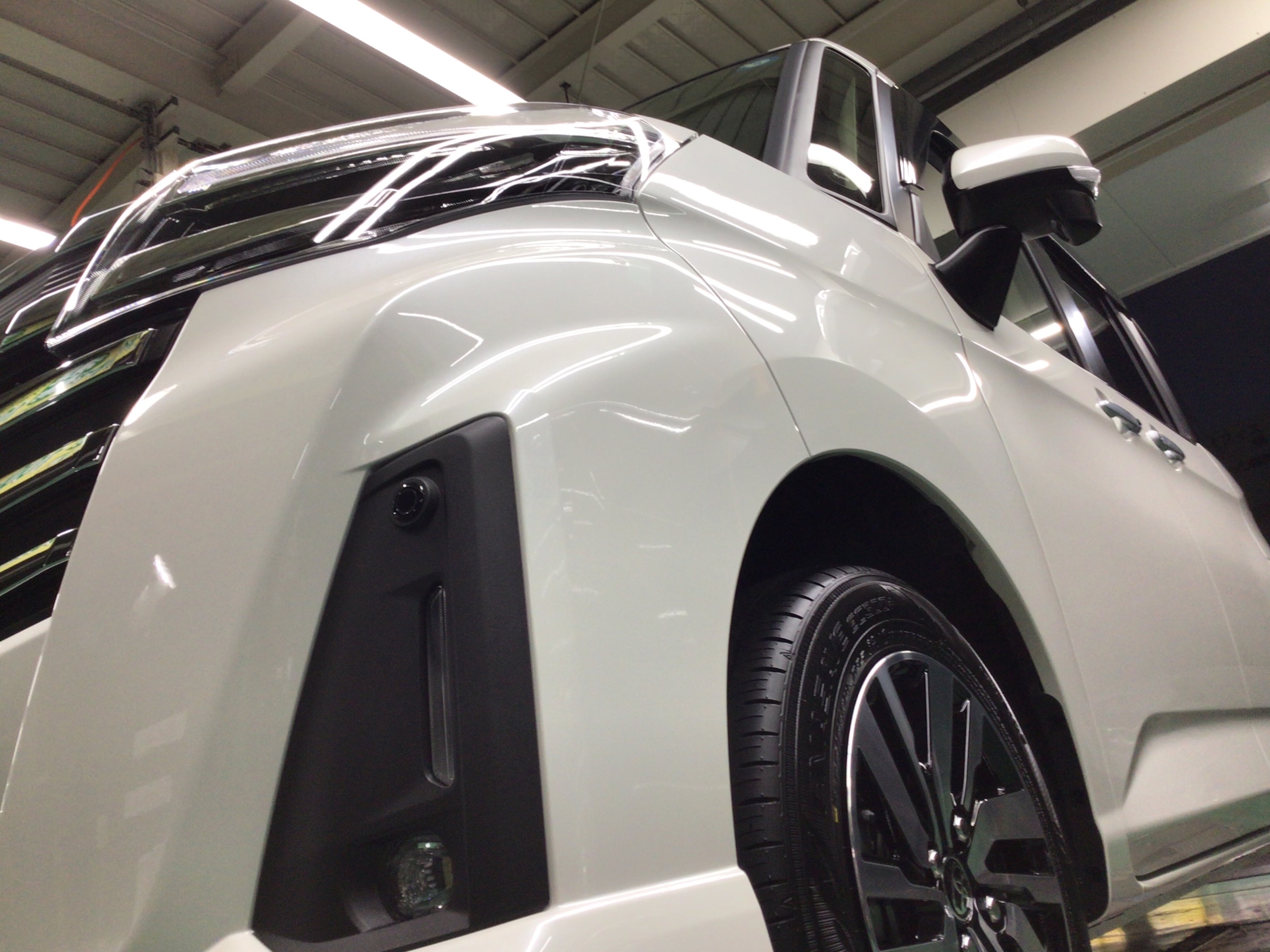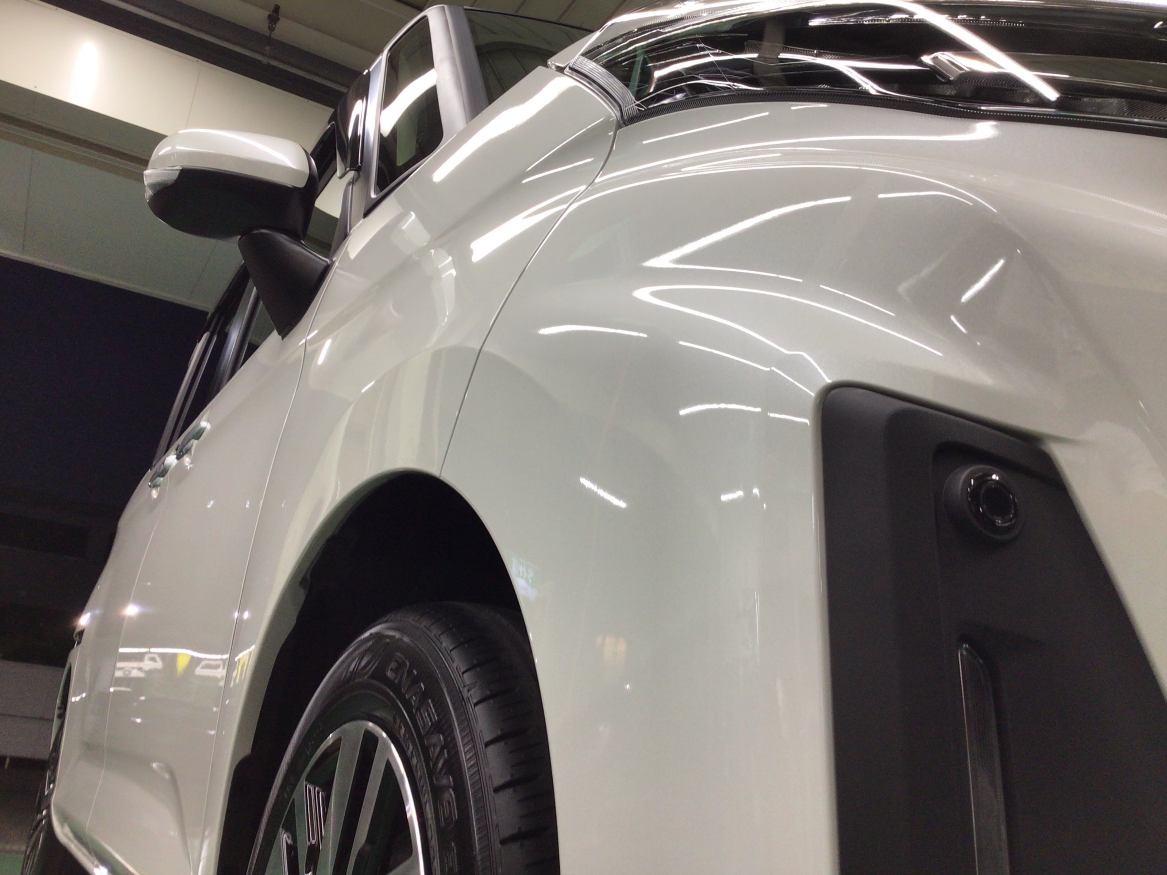 新車で納車まもないルーミーのボディをガラスコーティングで汚れの付きにくく、キレイでいい状態をキープできるコーティング施工をさせていただきました。このボディコーティングは提携先のコーティング屋さんの職人さんが来店しタイヤ館安城店で作業をするという流れです。