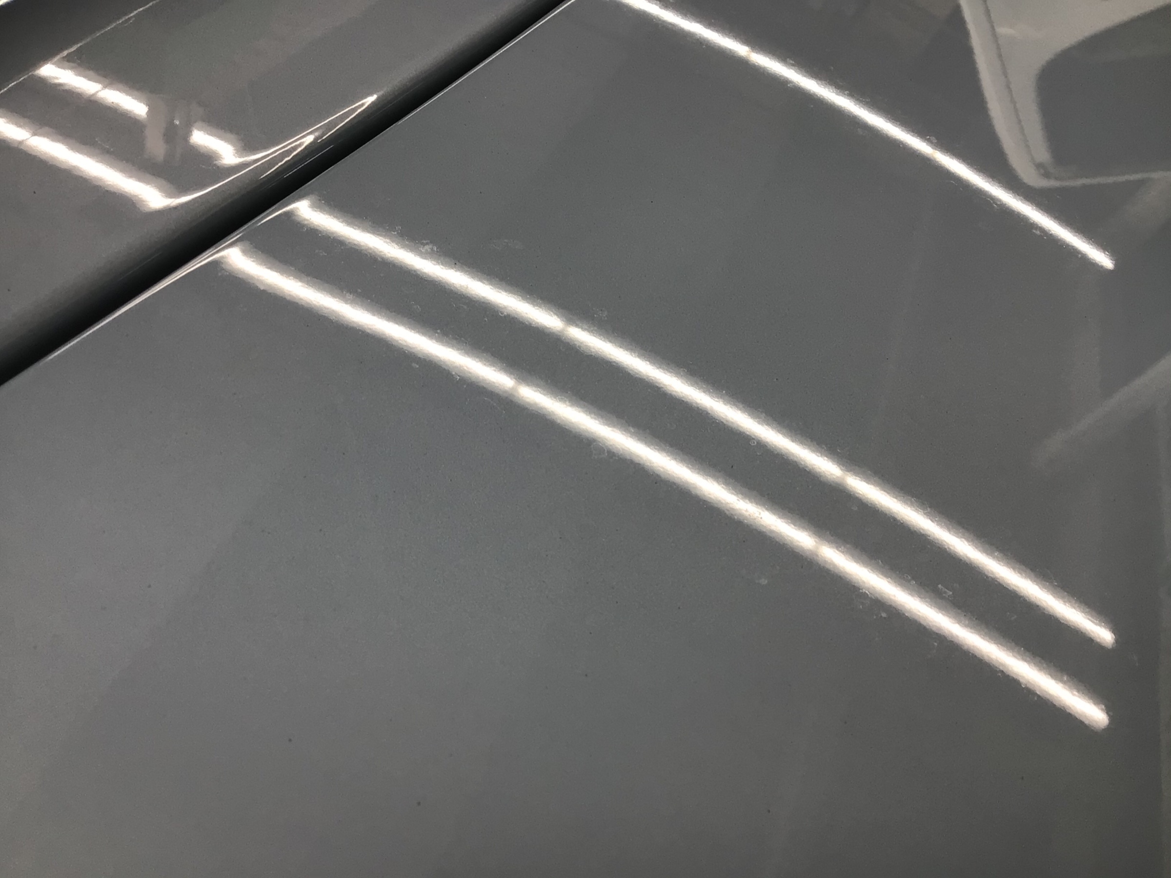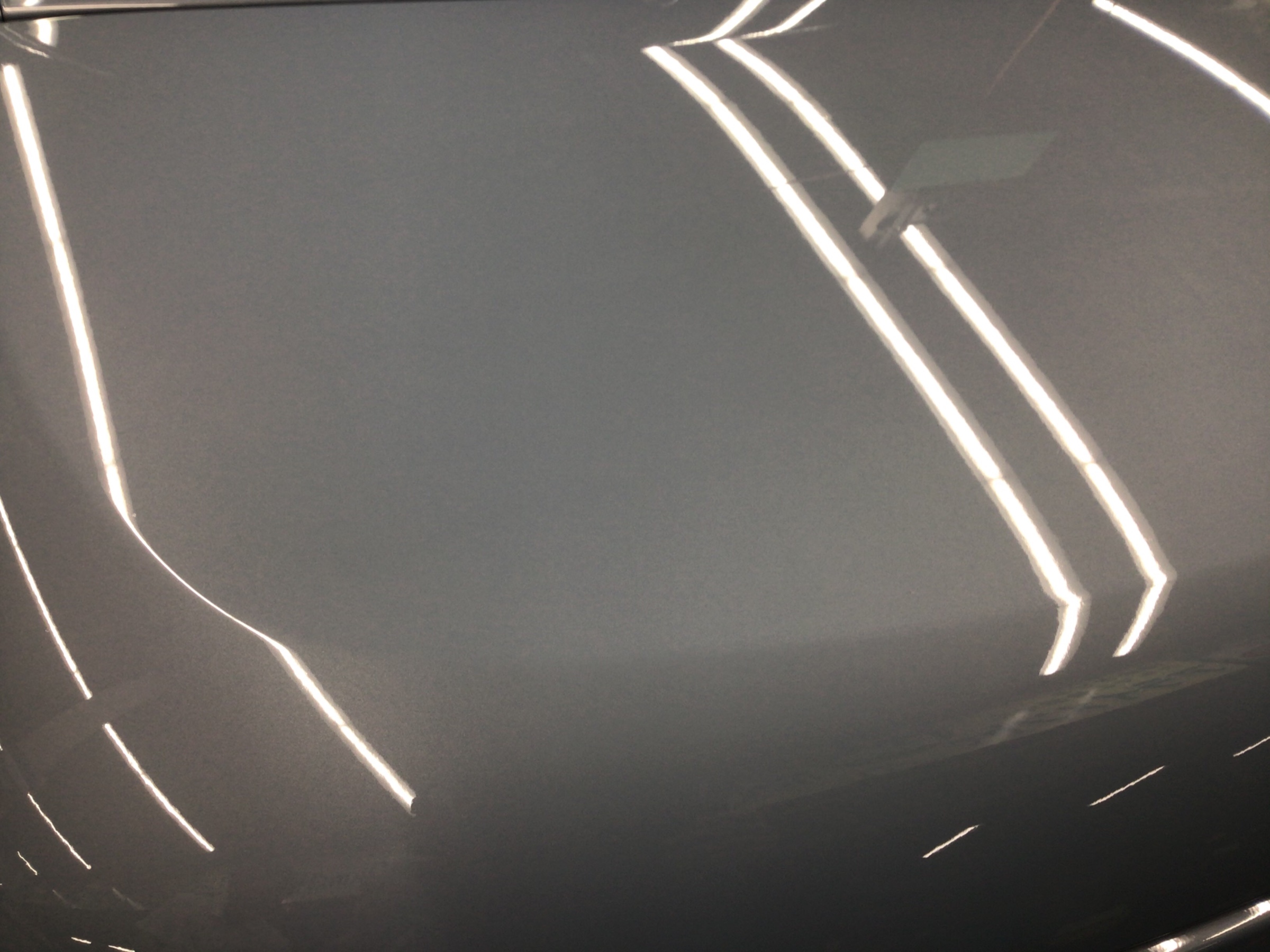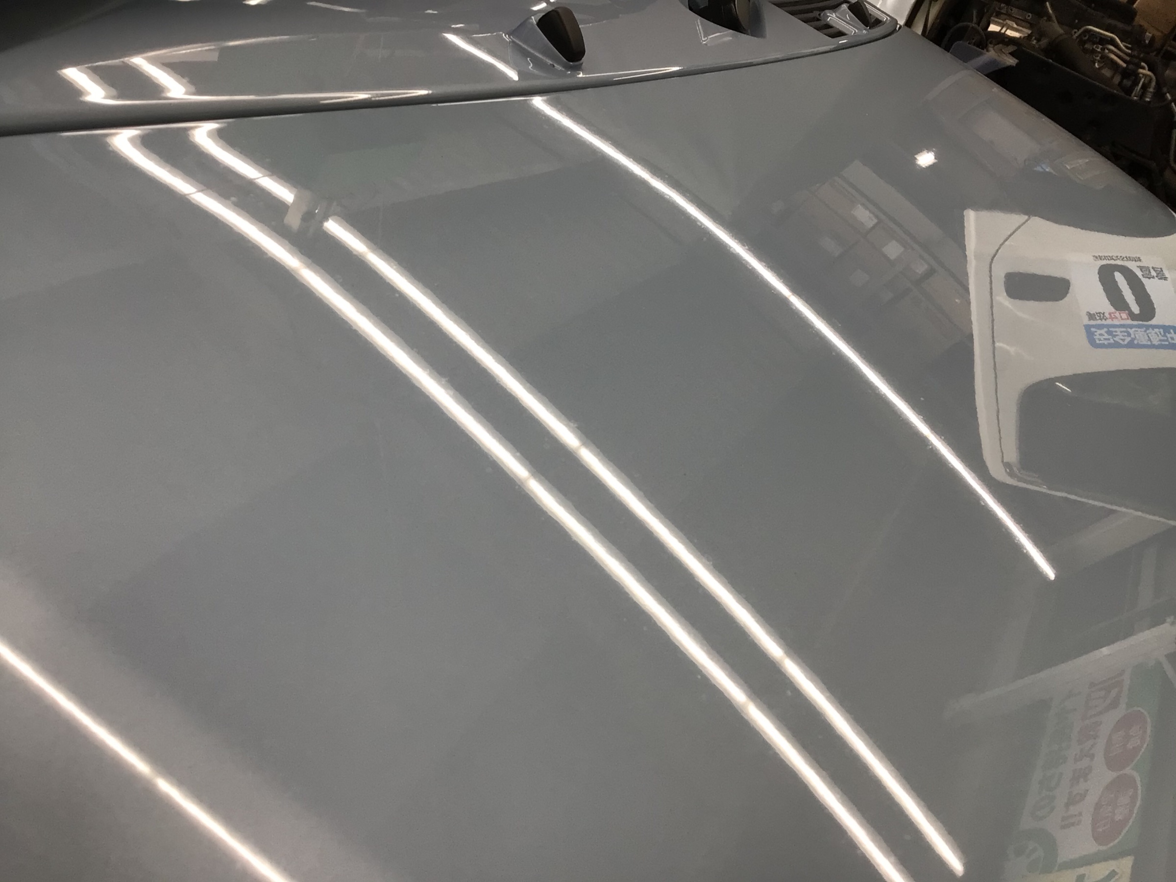 ユーザー様が気にしていたポイントは水アカ。下の画像の蛍光灯の光が反射しているところをよーく見てください。白くポツポツと乱反射しているものが見えると思います。普通の洗車では落ちない水アカ・ウォータースポット。ボディ表面を触るとザラザラとした感覚。