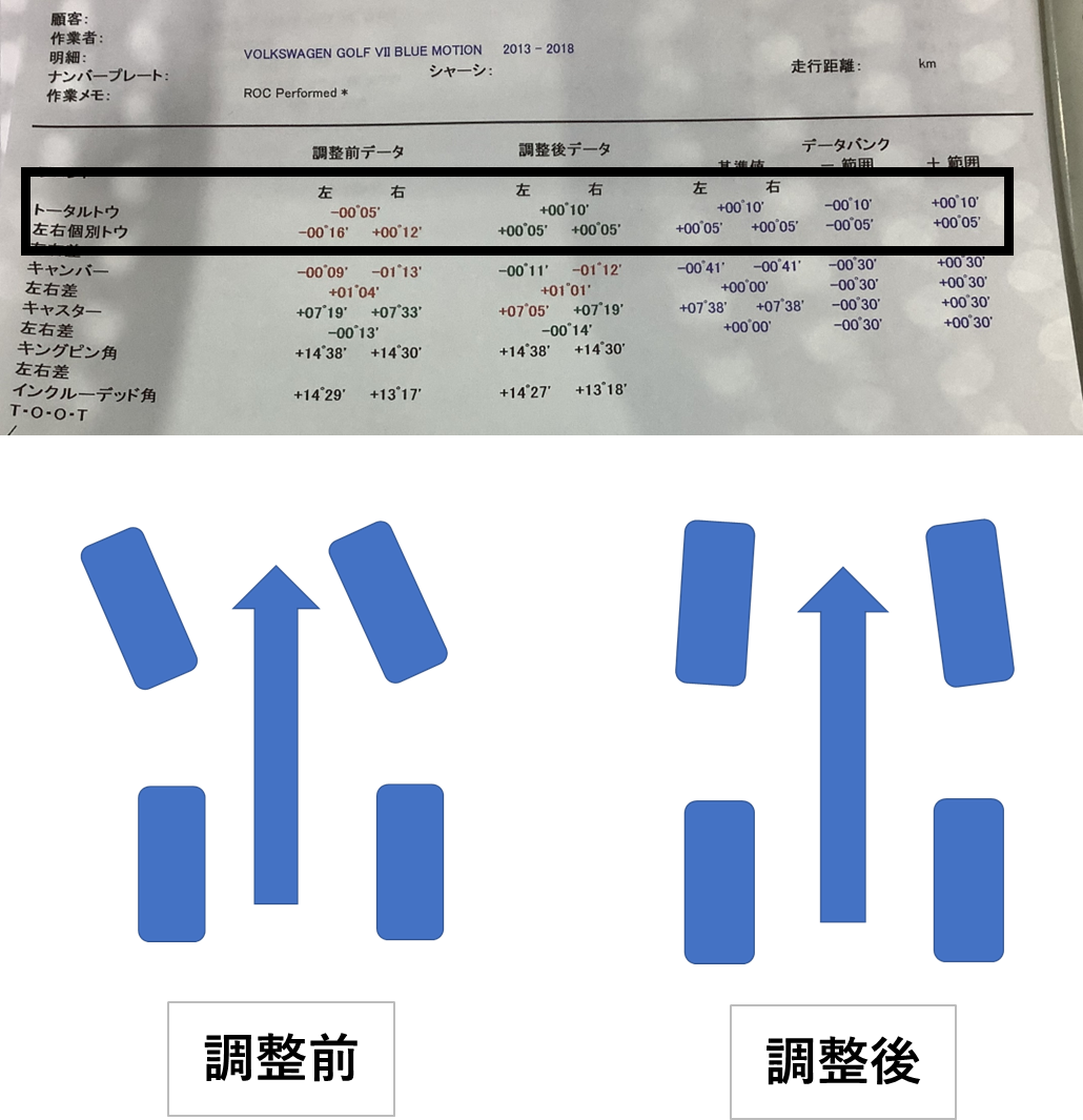 タイヤの取り付け角度の変化が疑われるため