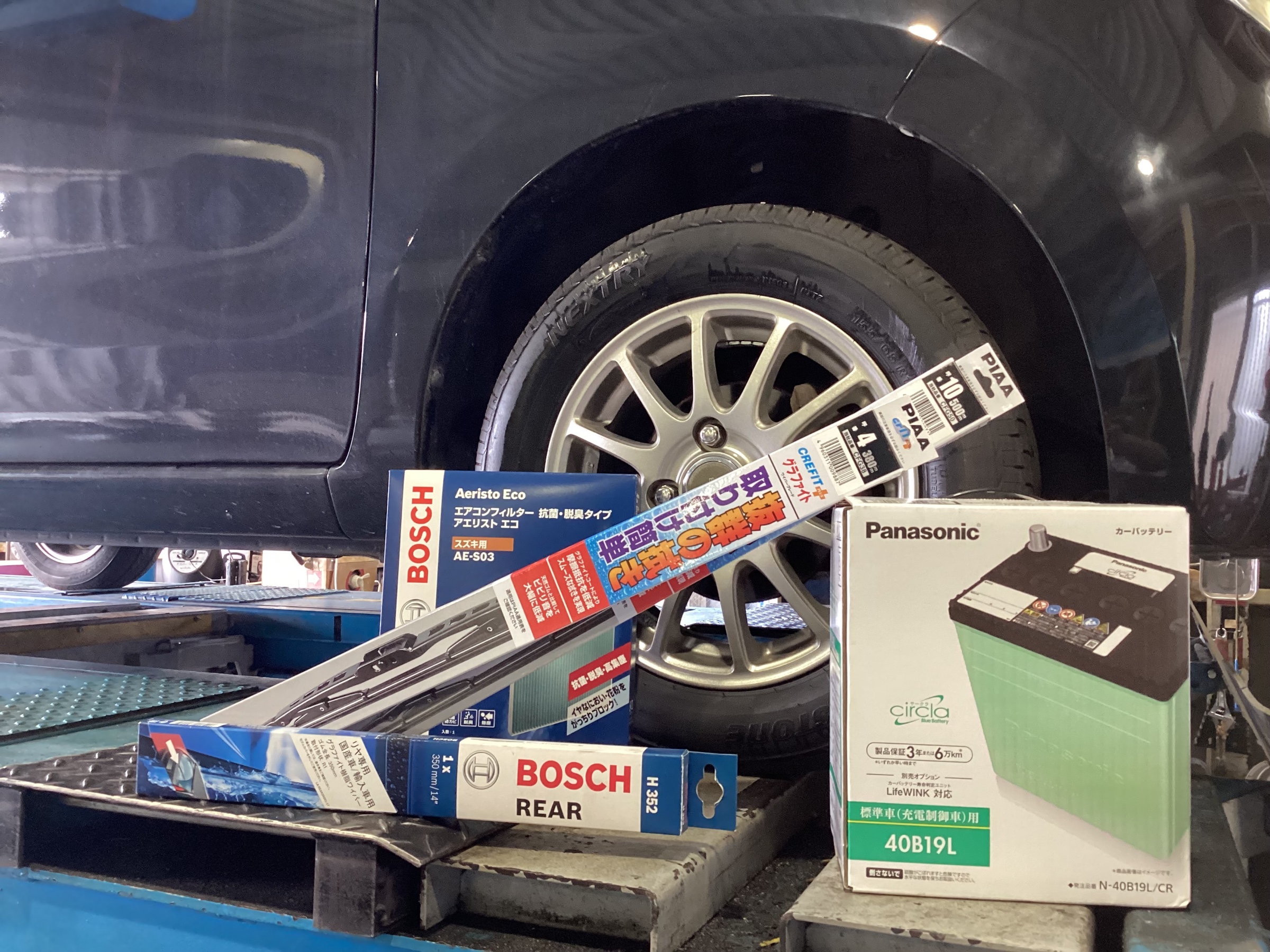 カーメンテナンス:オイル交換・オイルエレメント交換・バッテリー交換・ワイパー交換(3本)・エアコンフィルター交換