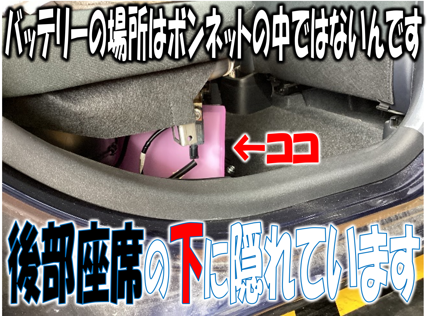 ・通常の車はエンジンルームにバッテリーが搭載されていますが、