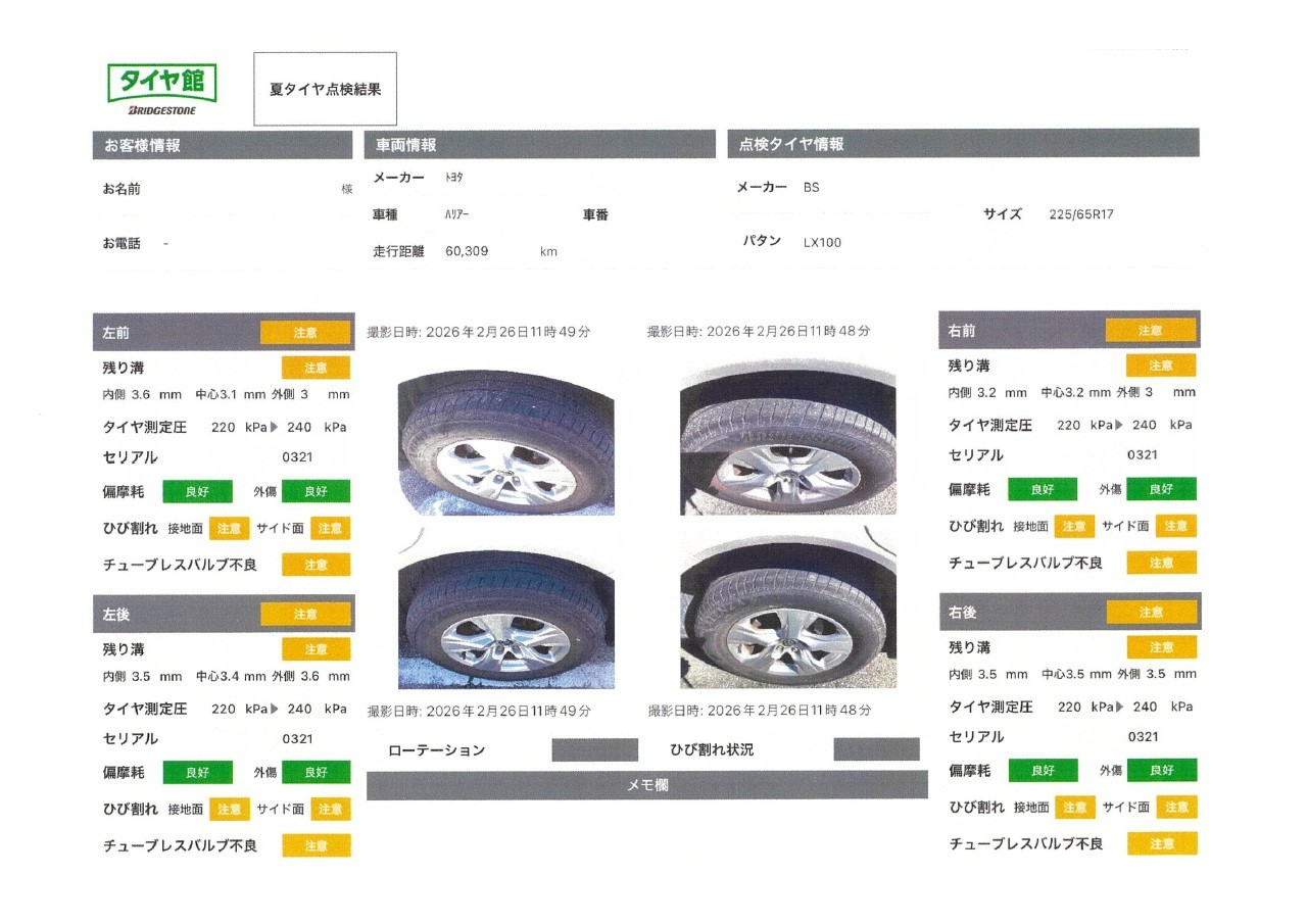 単に溝があるかないかだけでなく、摩耗の仕方から残りの寿命を計算し、あとどれぐらい使えるかご相談致します。
