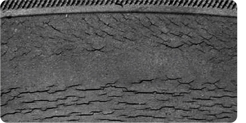 不良例: 縁石に擦った傷や、経年劣化によるひび割れ。特に深いひび割れは、中のワイヤーが錆びたり、走行中に剥離したりするリスクがあります。