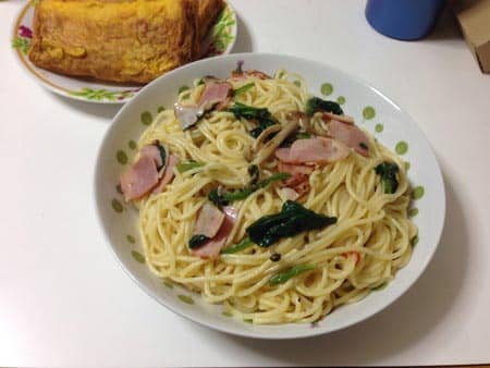 「きのことほうれん草とベーコンのあっさり和風パスタ」
