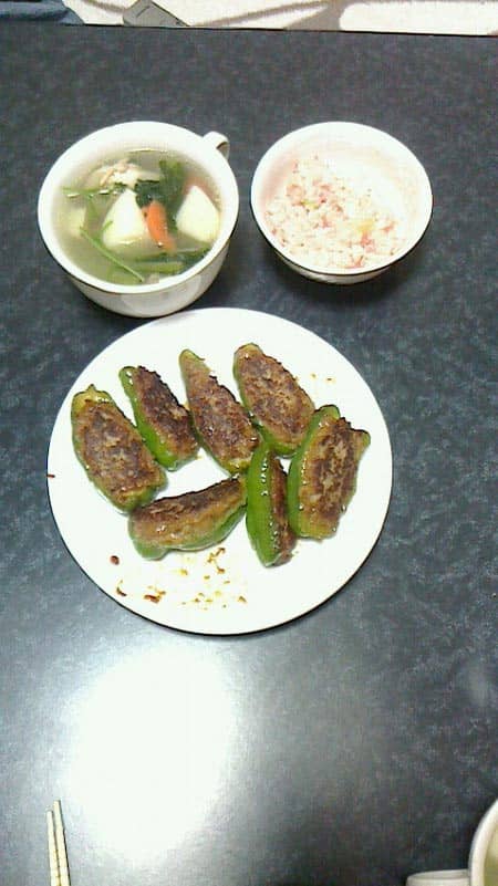 桜海老と枝豆の炊き込みご飯、ピーマンの肉詰め、塩ポトフです(^o^)