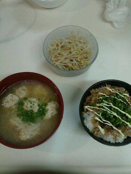 子供も大好きな、ツナのそぼろご飯と鶏団子味噌汁です(^o^)丿