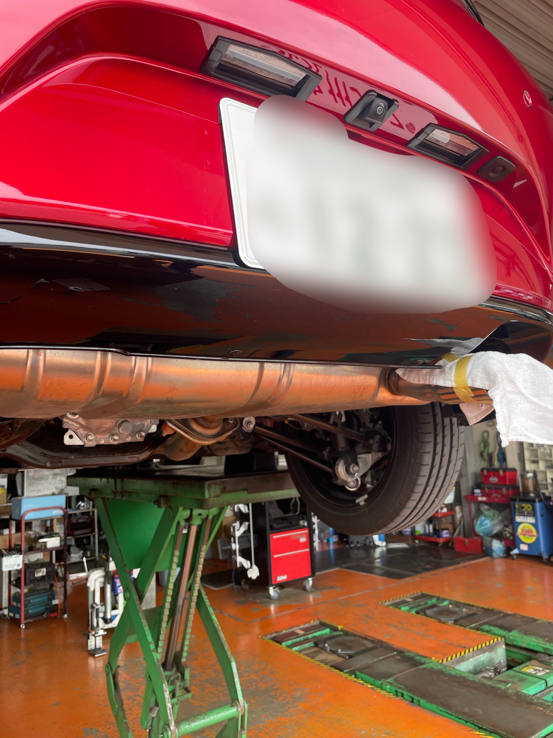 早速車体にキズが入らないように養生をして、純正マフラーを外していきます‼️