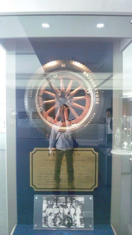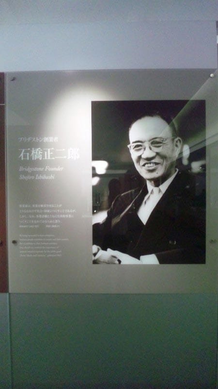 画像は上から創設者の石橋正二郎さんで、次がブリヂストンが作った第1号のタイヤで、最後が工場入口の看板です!