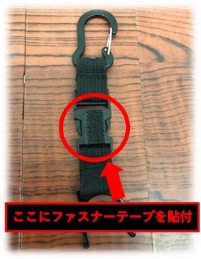 ペットボトル用のバックル付きカラビナを固定(一体化)したら、