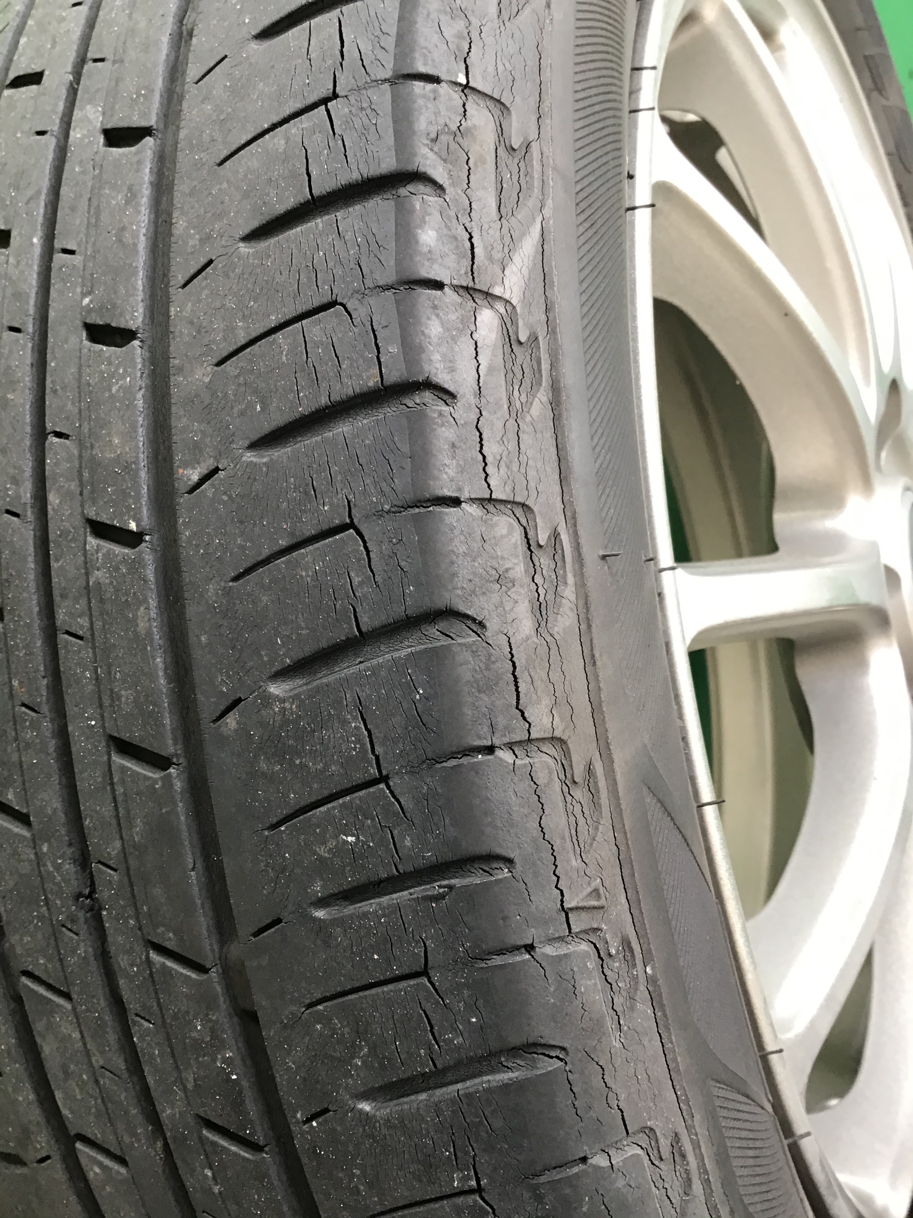タイヤの溝はまだ残っていましたが、ショルダーからサイドウォールにかけてのひび割れが進行していました為、交換となりました。