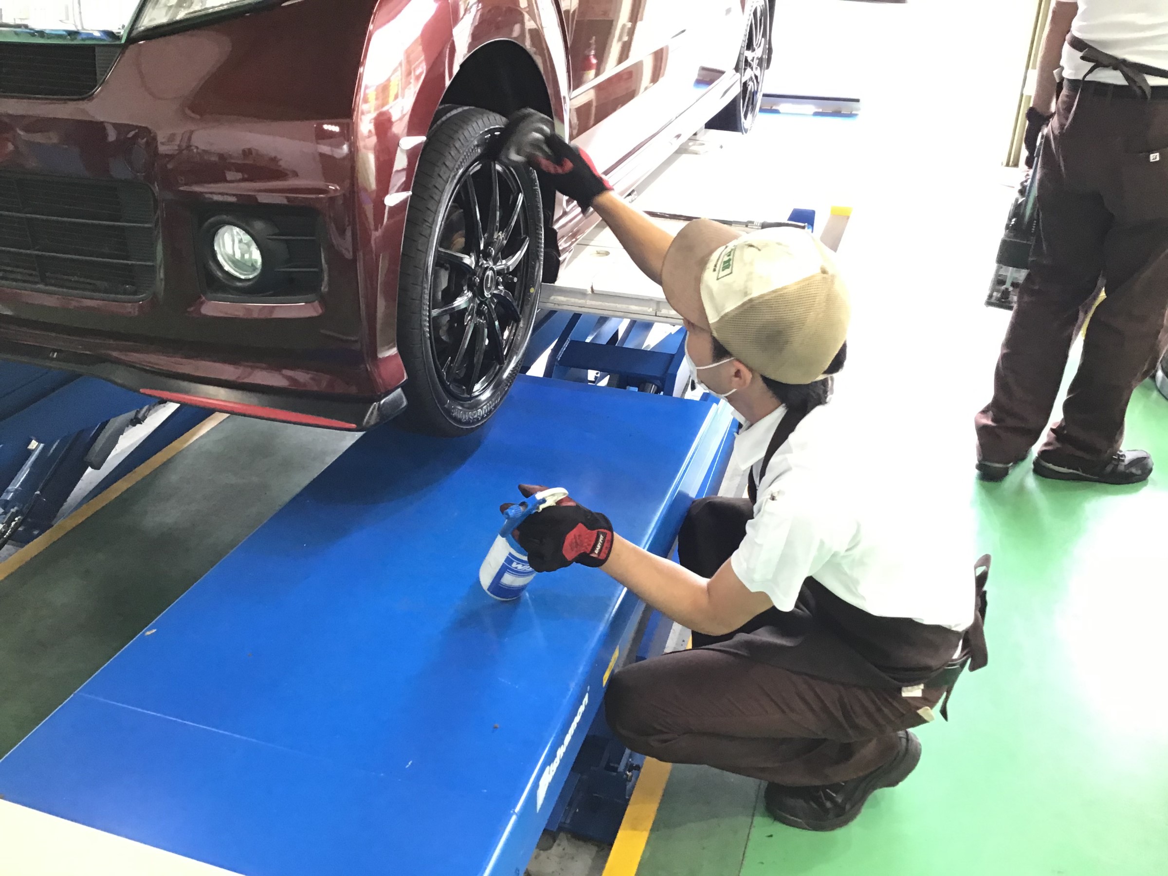 井上主任にビシバシ鍛えられながら、入念にタイヤワックスを塗ってくれる徳田スタッフ
