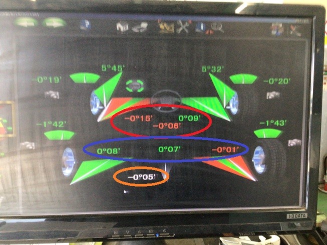赤丸部分はフロントのトー角。ハンドルセンターズレもありますが、トータルトー角もトーアウト方向にずれています。