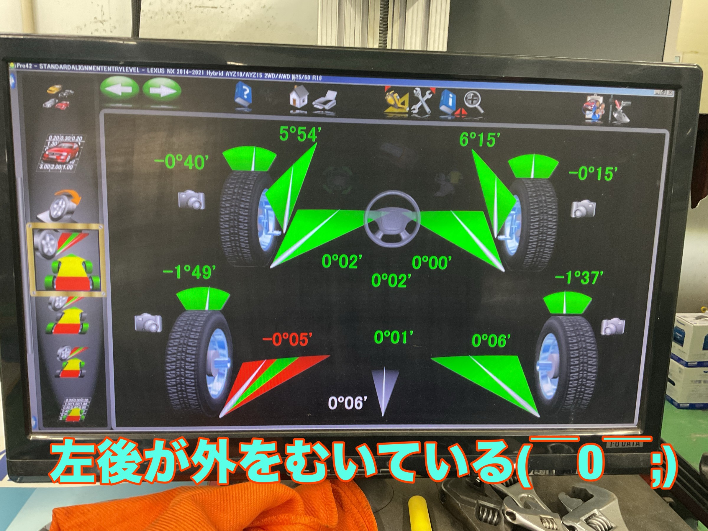 オーナー様は「走行距離も少ないからズレてないよ!」とのご意見でしたが、、、左後輪のタイヤが外を向いておりましたので(数値が赤くなっている場所)直進安定感が悪くなって