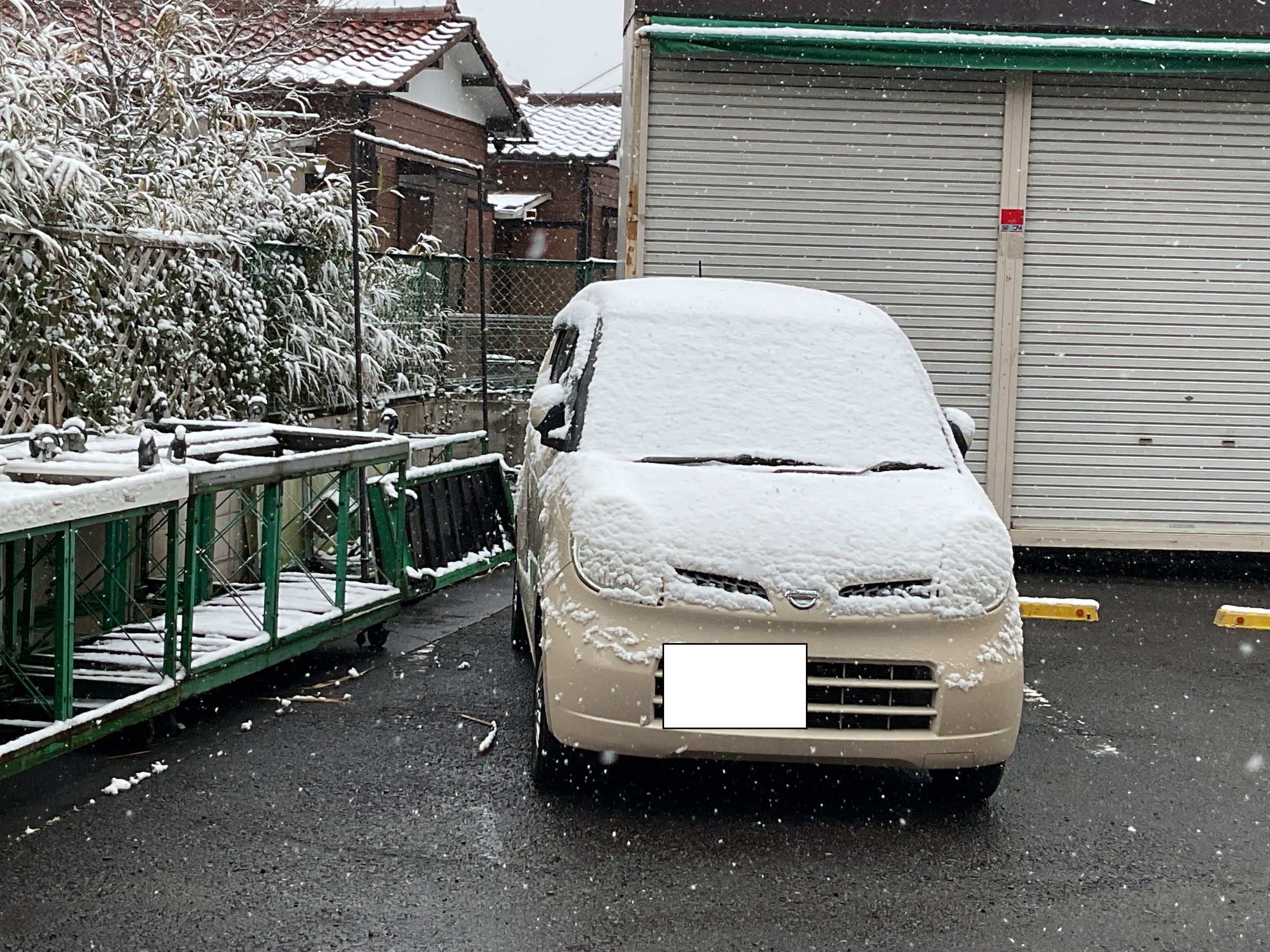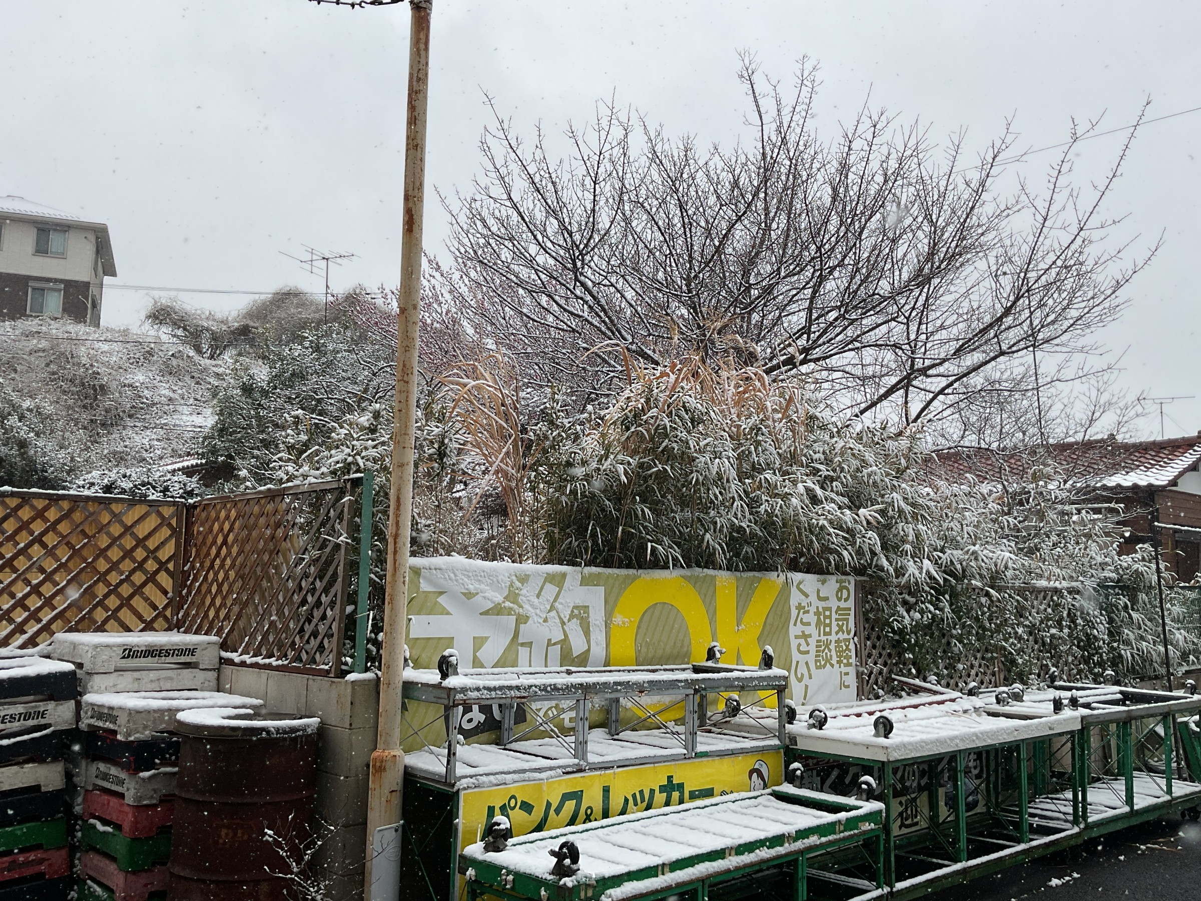 タイヤ館大船の代車にも雪が積もっており