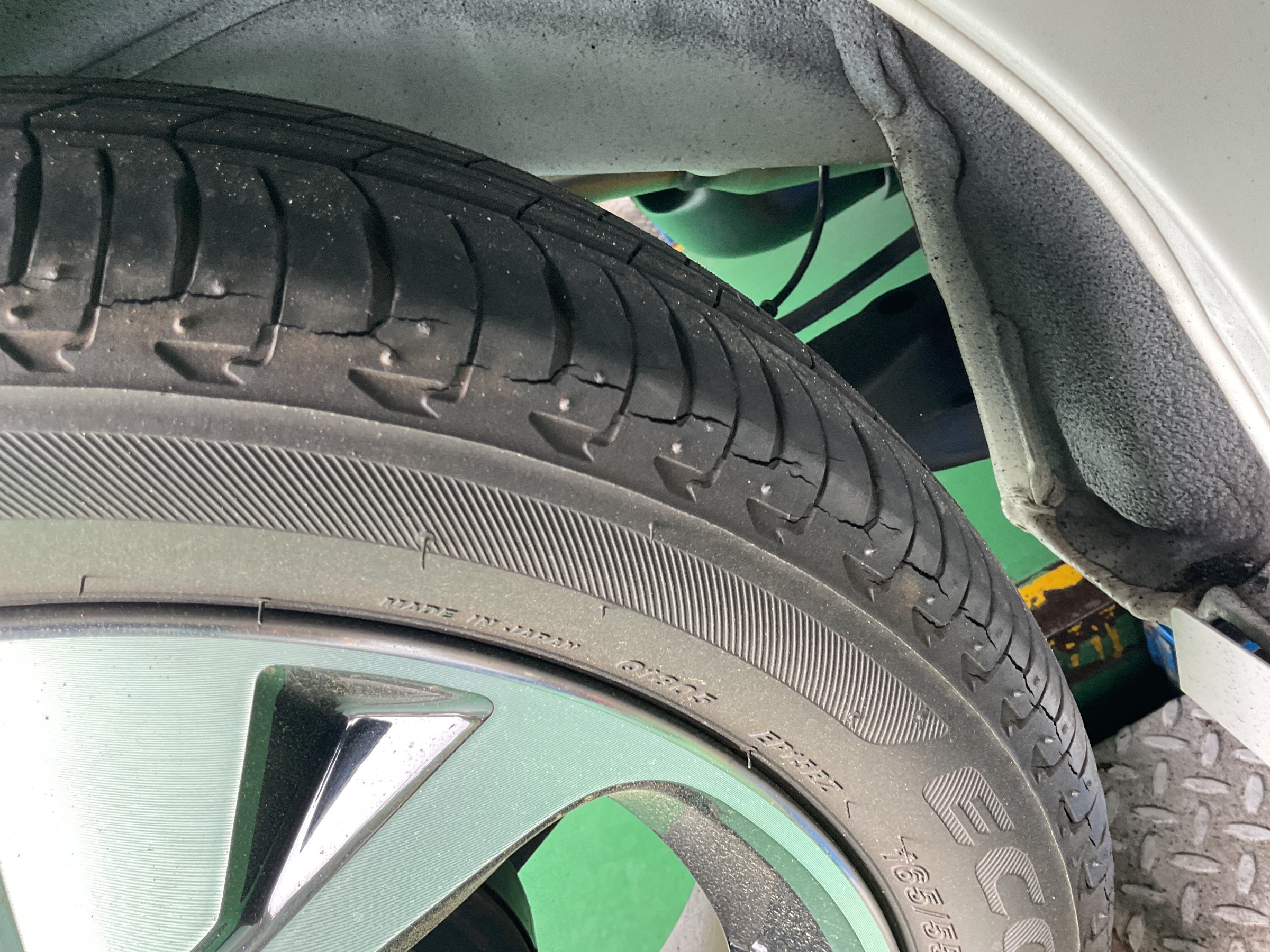 本日タイヤ交換していただいたルークスですが5年間で6000キロほどしか走行しておりません。しかし写真のタイヤ、ショルダー部分に大きなヒビが全体的に入っております。