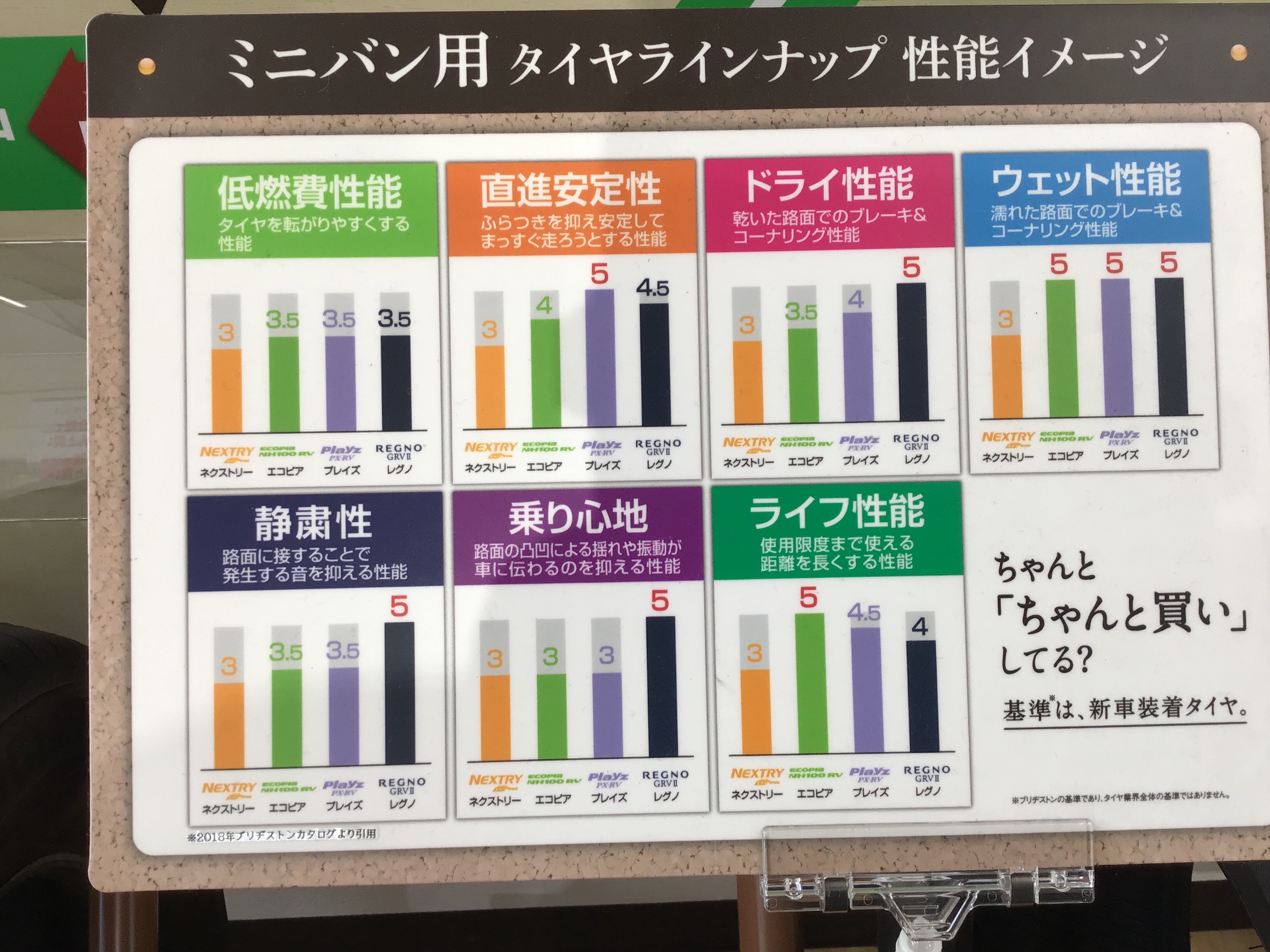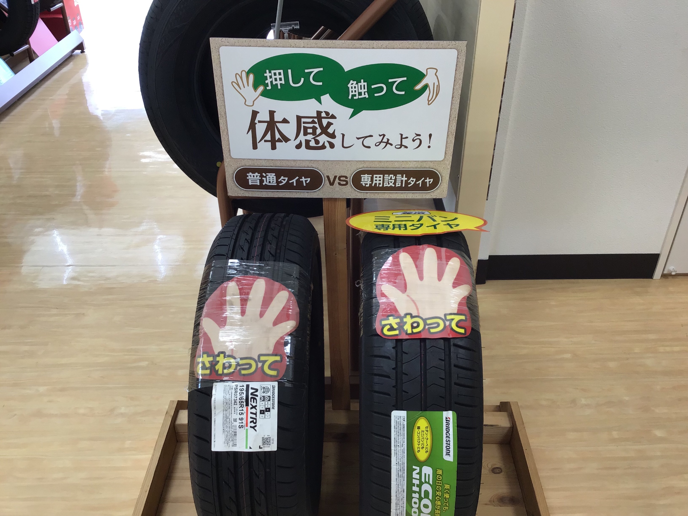 手でグゥ~って押し比べるとミニバン用と普通タイヤとの違いが分かりやすいかと思います!