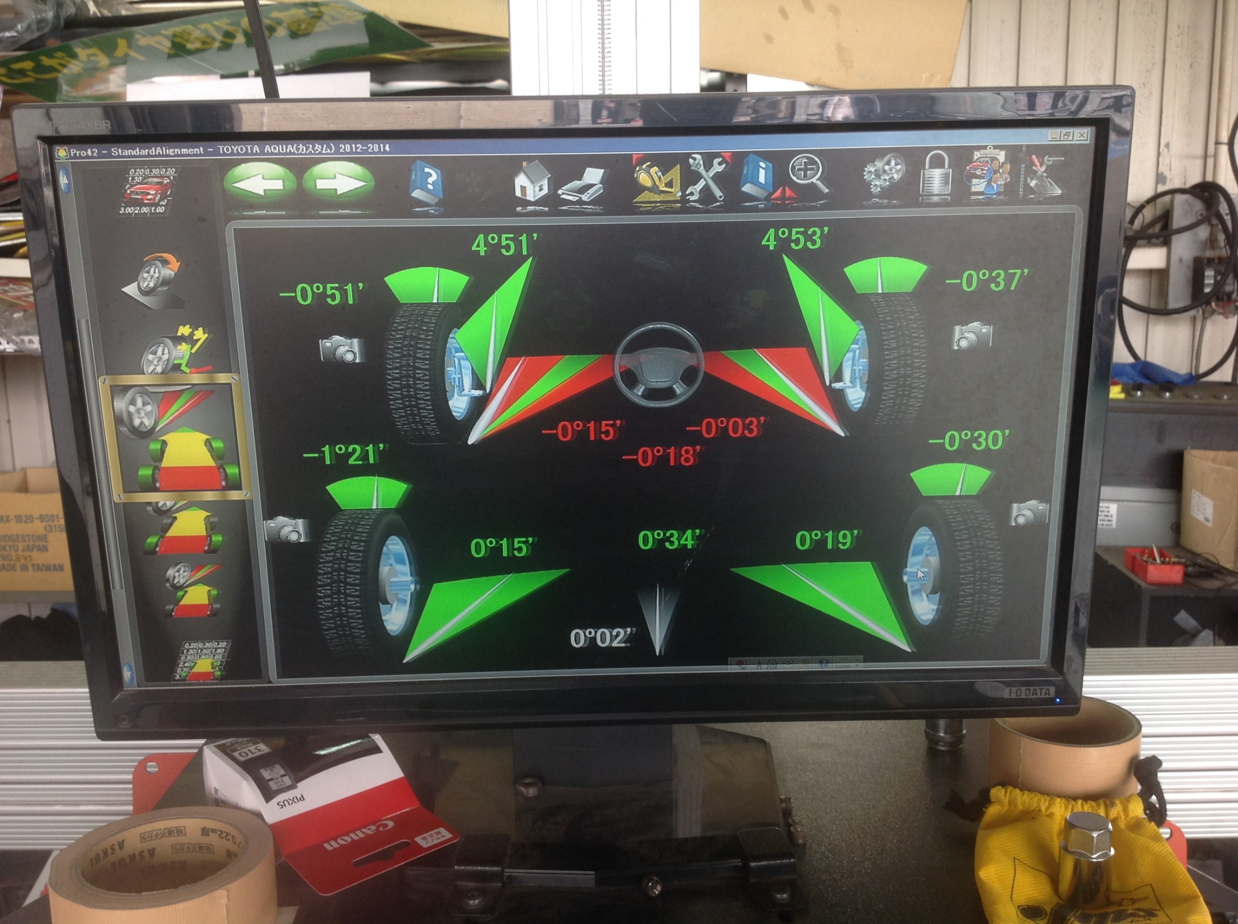 トヨタ アクア アライメント調整いたしました! ポスト 2017年5月22日 先日、トヨタアクアのアライメント調整させて頂きました! タイヤ交換時にアライメント調整されたお客様で、ローテーション時に またまたさせて頂きました! 前回から6000Kmぐらい走られてましたが、、、 やはりずれていました(>_<) ですが今回もしっかり調整させて頂きました! 担当:武内