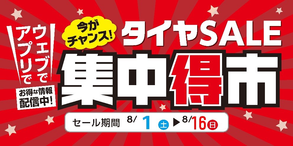 タイヤ館では集中得市開催中です!お出かけ、お出かけ後のタイヤ点検はおすみですか?