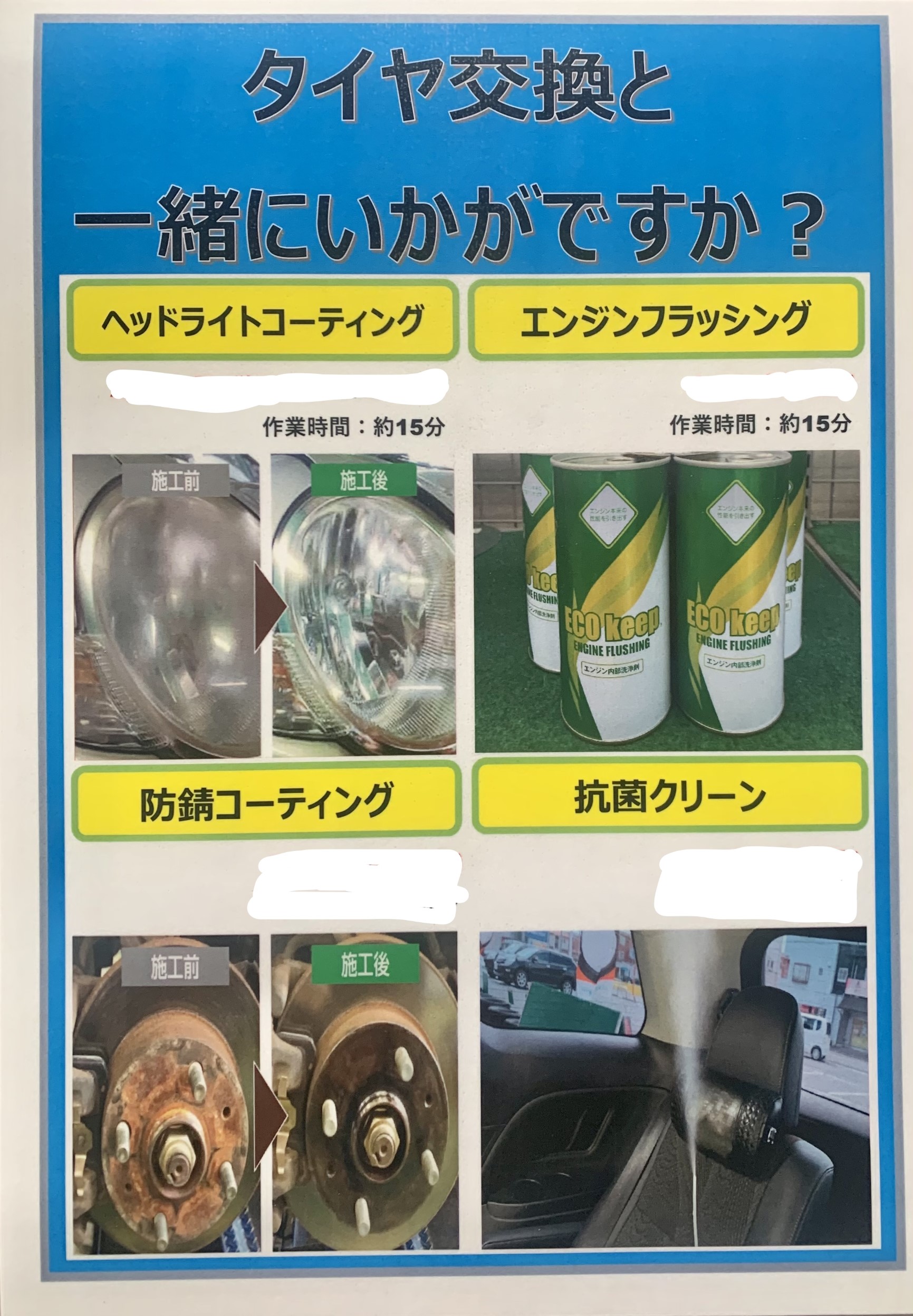 この四点のサービス、タイヤ交換と同時に施工可能なため、待ち時間もかかりません。