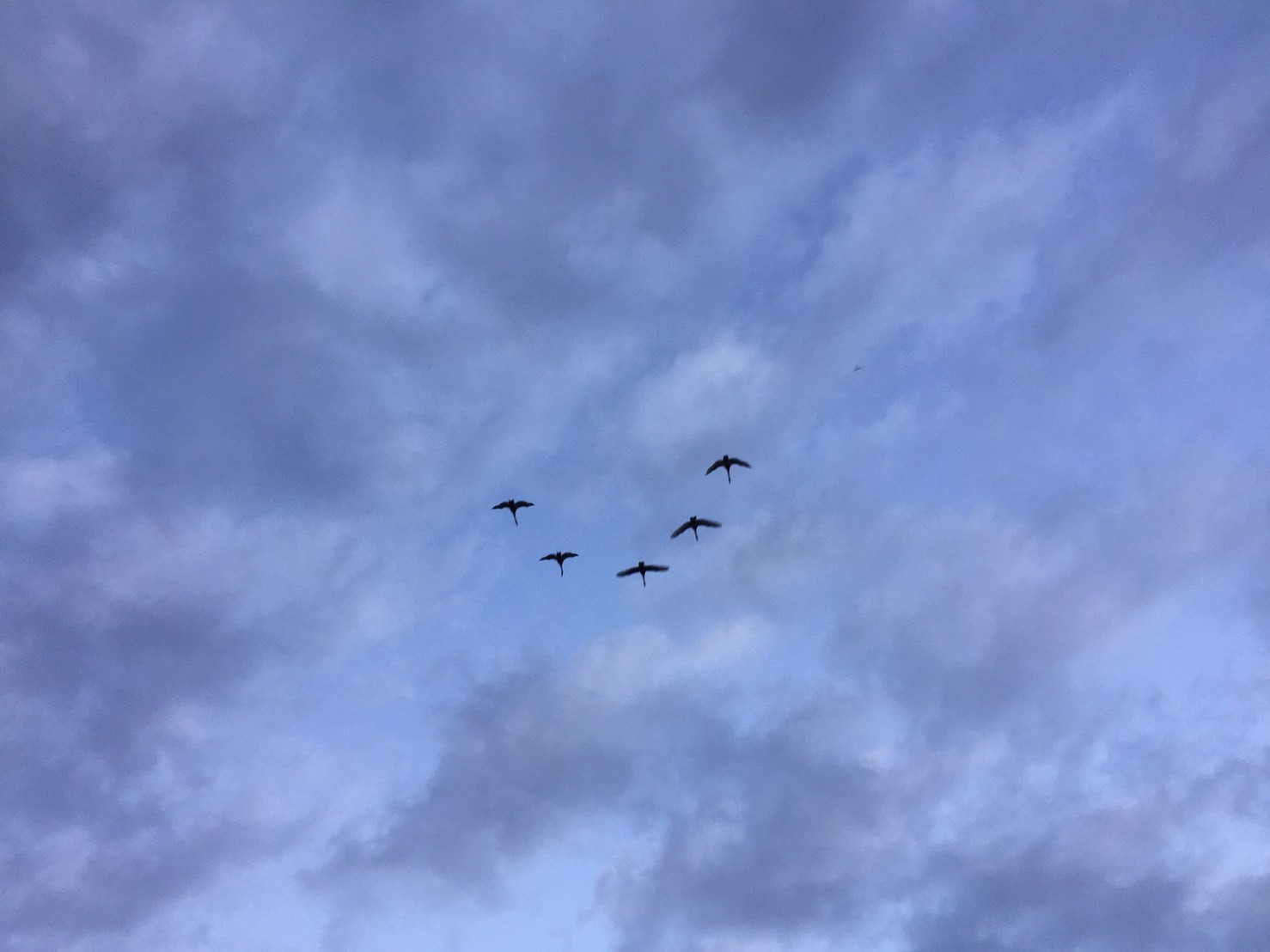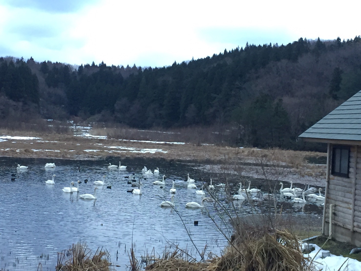 雪の中、白鳥が泳いでいたり空を飛んでいたりと