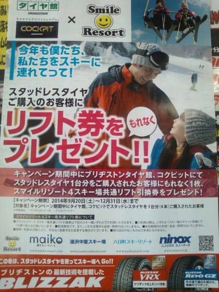 『スタッドレスタイヤご購入で、スキー場リフト券プレゼント』