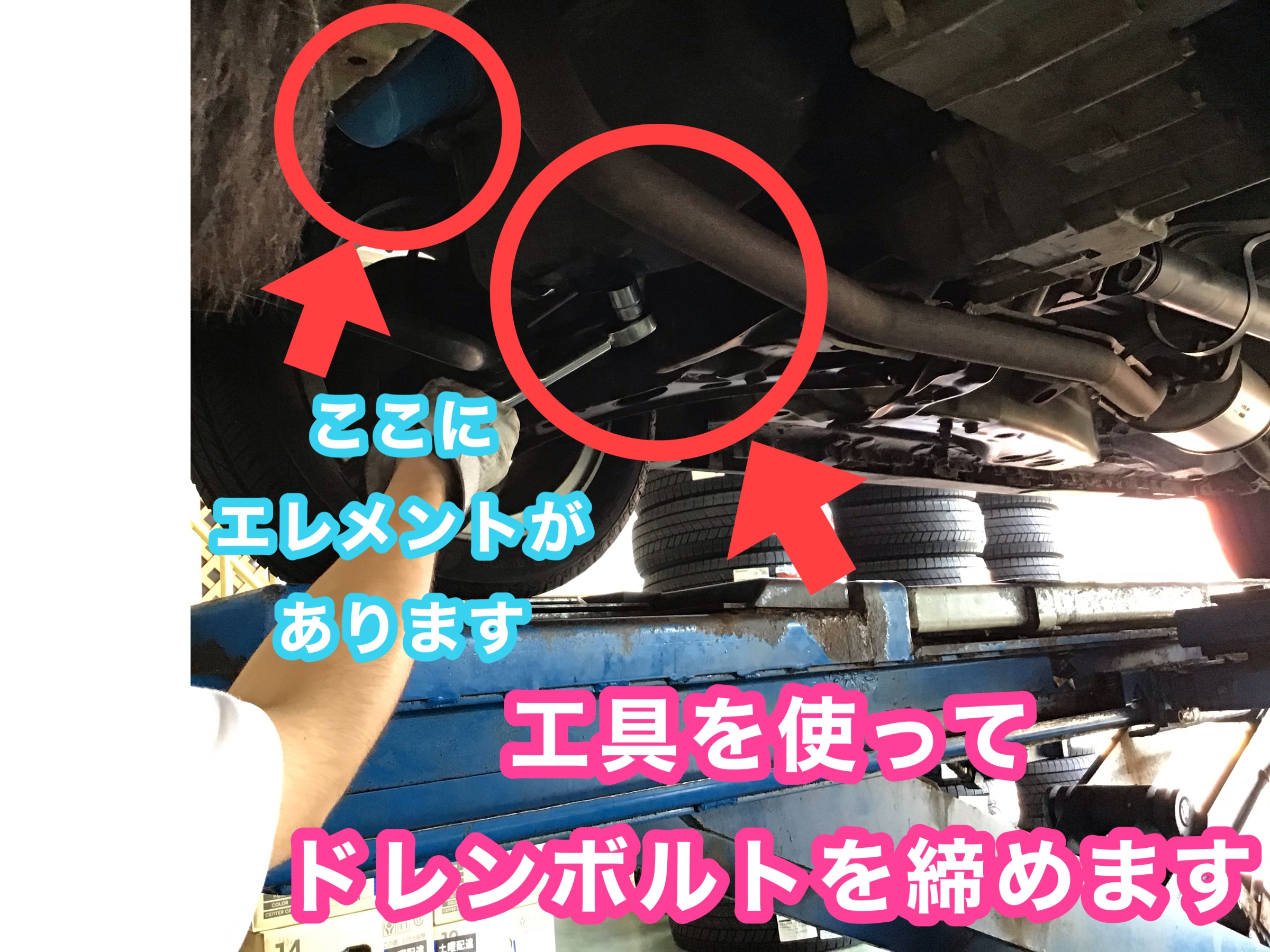 エレメントとドレンボルトをしっかり締めます。