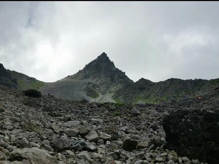 着いた頃には頭上にどどーんとそびえ立っていた槍ヶ岳も、テントを設営していた数分間の間に雲の中へ・・