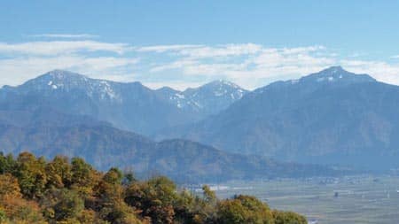 湯沢へ向かう道中に見えた越後三山には、雪化粧となっていて、