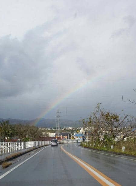 出勤道中・・・一瞬の晴れ間から大きな虹が見え、思わず写真を撮ってしまいました。