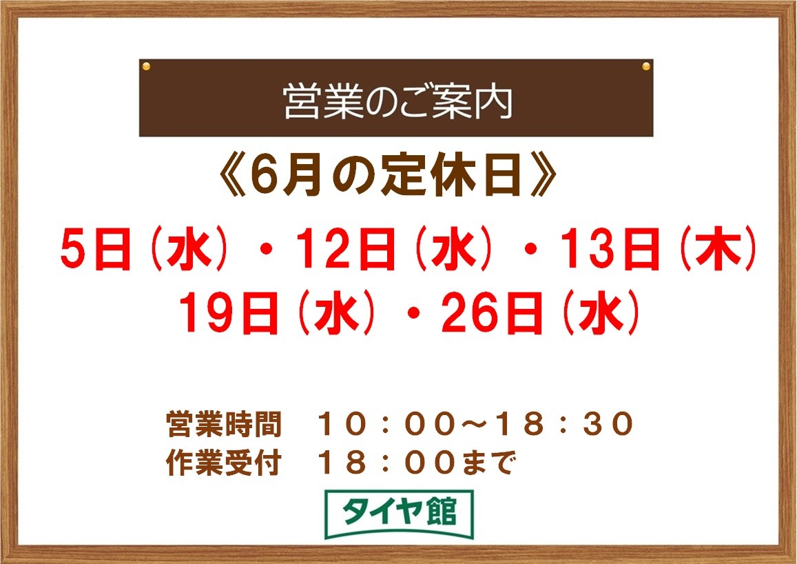 6月定休日のお知らせ ポスト 2024年5月31日 いつもタイヤ館小千谷をご利用いただき 誠にありがとうございます! 【6月の定休日】をお知らせいたします。 6月の店舗休業日は 5日(水)・12日(水)・13日(木)・19日(水)・26日(水)です。 ご不便をおかけしますがよろしくお願いいたします。 カテゴリ:お知らせ