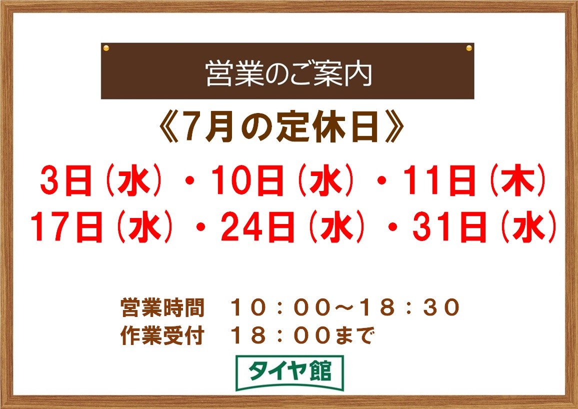 7月定休日のお知らせ ポスト 2024年6月27日 いつもタイヤ館小千谷をご利用いただき 誠にありがとうございます! 【7月の定休日】をお知らせいたします。 7月の店舗休業日は 3日(水)・10日(水)・11日(木) 17日(水)・24日(水)・31日(水)です。 ご不便をおかけしますがよろしくお願いいたします。 カテゴリ:お知らせ