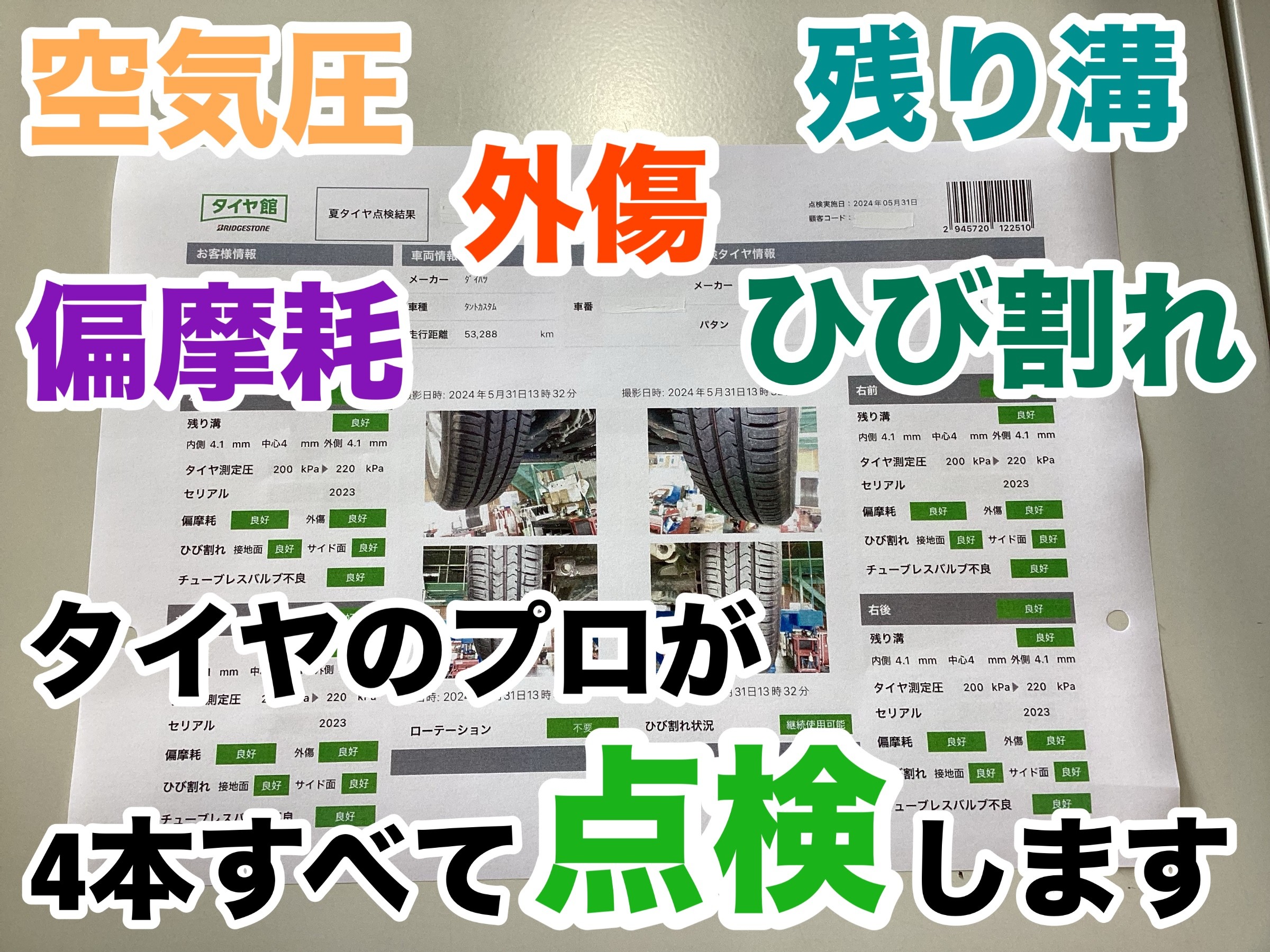 また空気圧だけでなくタイヤの摩耗状態や外傷なども