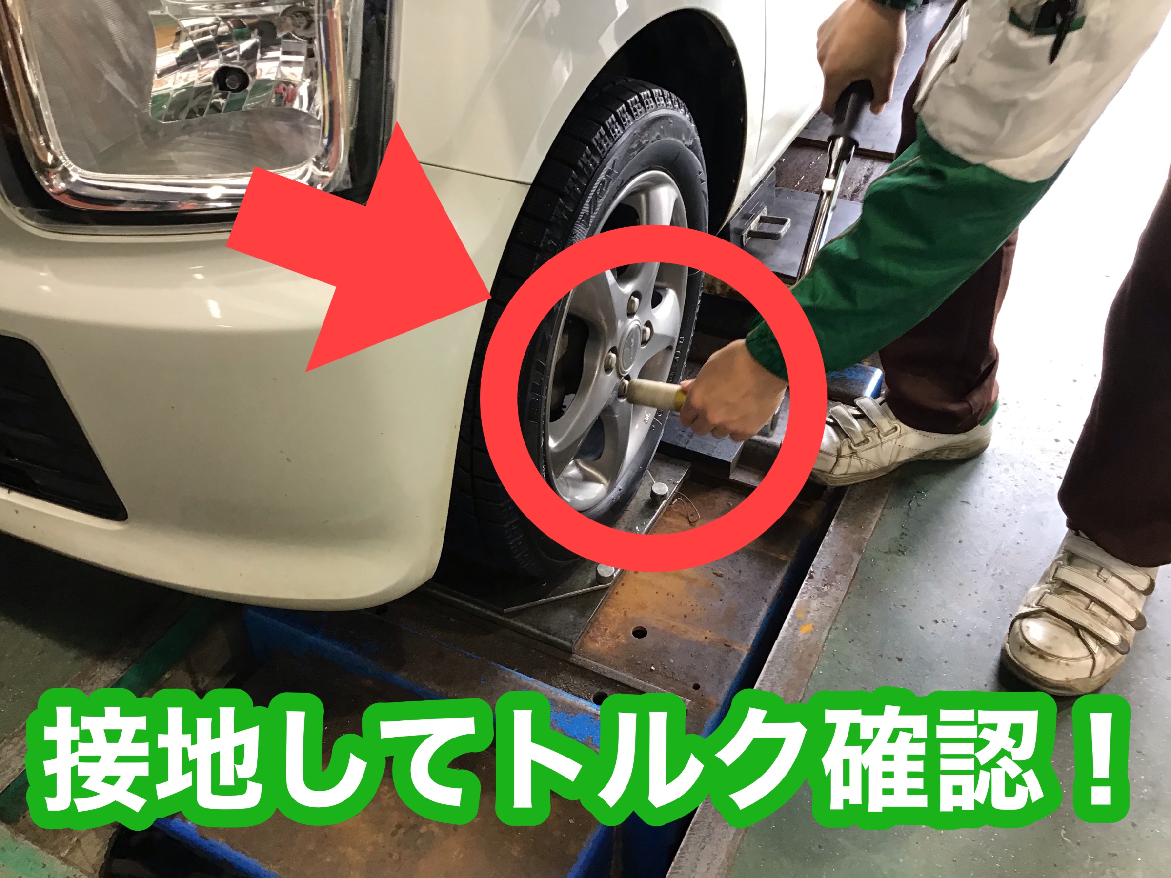 お車を地面に接地させて再度トルク確認します!