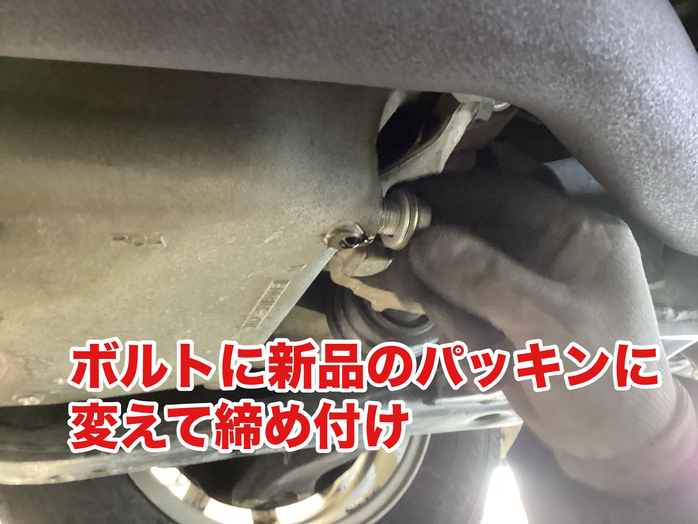 エンジンオイルを排出するドレンボルト取外し