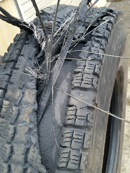 経年変化でヒビや傷の箇所より内部のコードからタイヤ接地面が剥離したケースです。