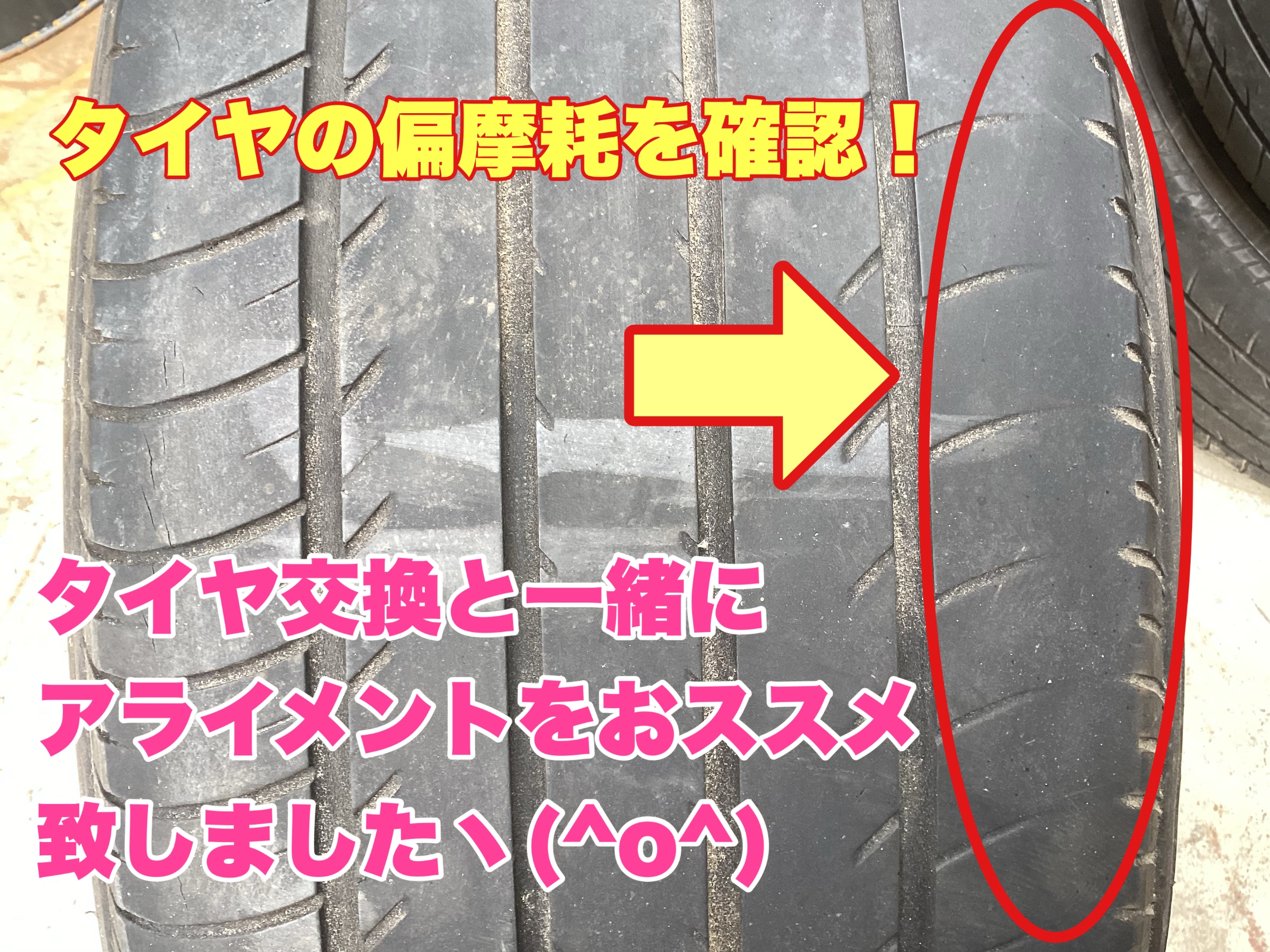 タイヤの外側に偏った摩耗を確認!!!