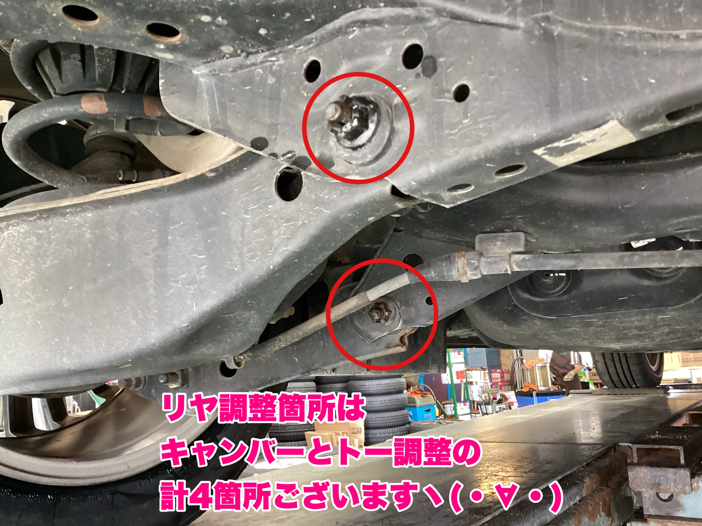 リヤはキャンバーとトー調整の4か所