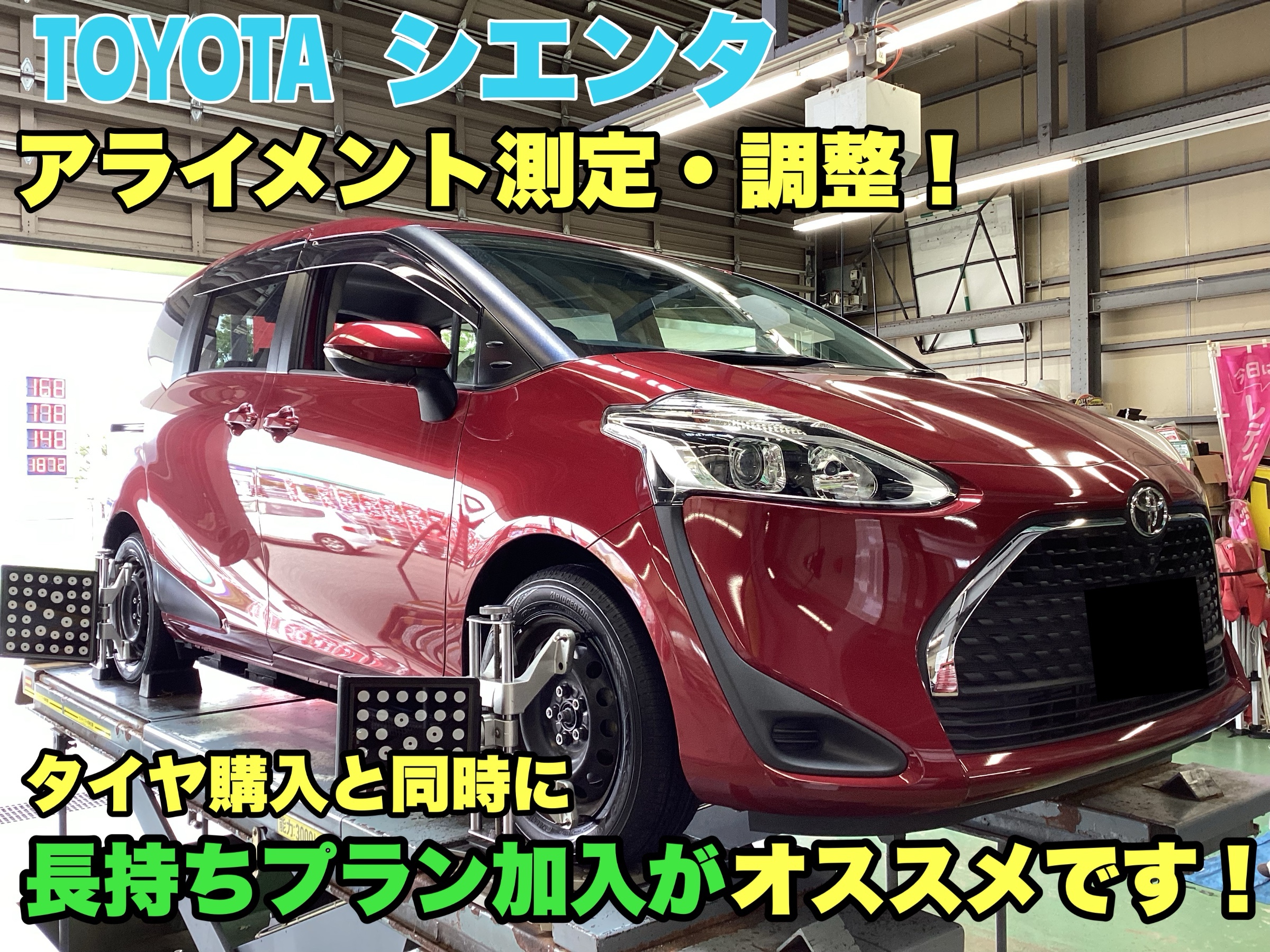 タイヤ購入時はアライメントの測定がセットになったタイヤ長持ちプランがオススメです!【トヨタ シエンタ】アライメント測定・調整