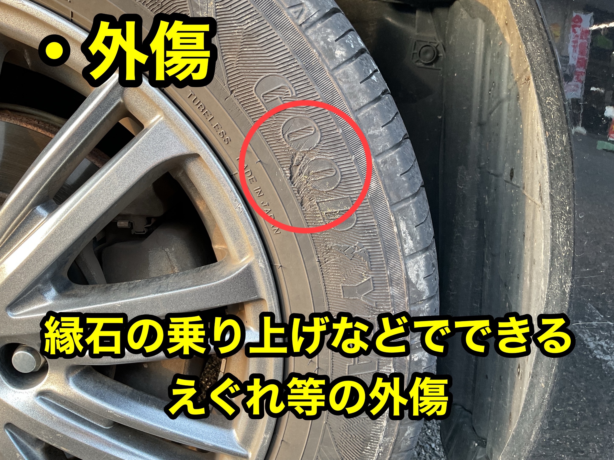 縁石に擦ってしまったりする事で発生します