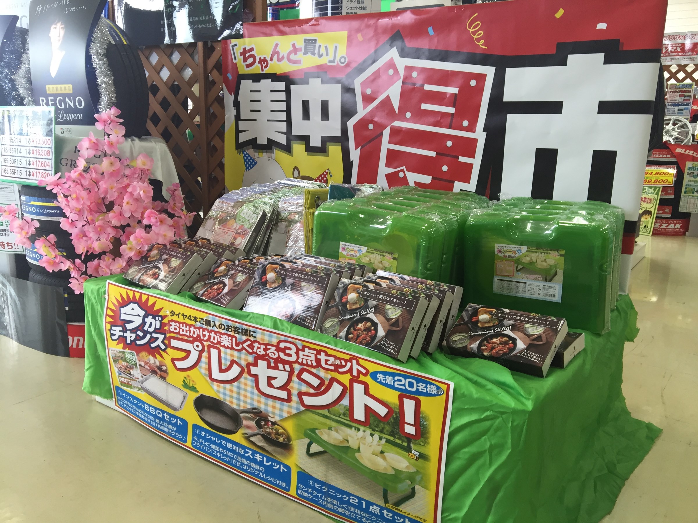 期間中タイヤ4本ご購入のお客様に、すぐにバーベキュウが始められる3点セットプレゼント中です!!