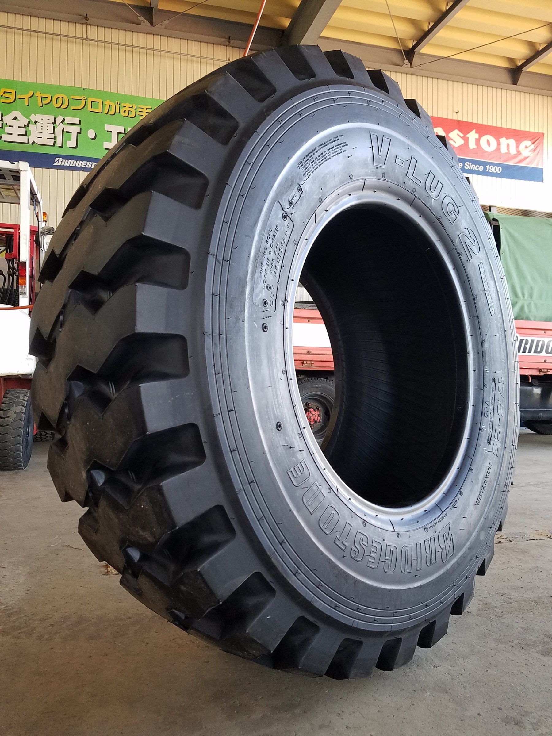 このタイヤは建設現場で働くタイヤショベルに装着されているタイヤです。