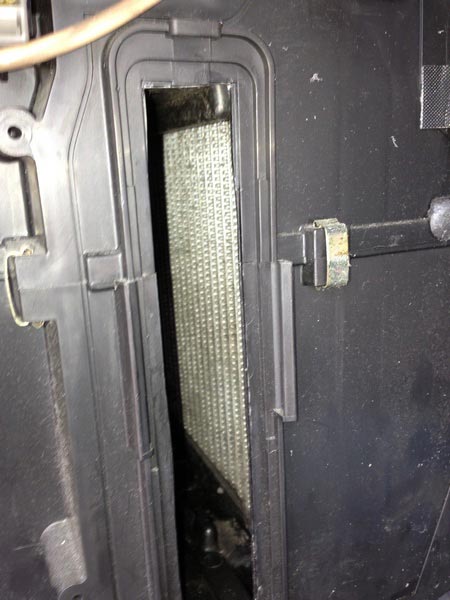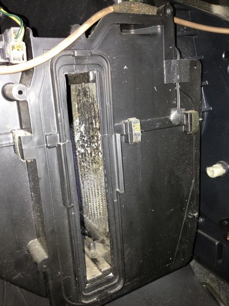 というご相談がありお車のエアコンを調べてみたらなんとエアコン内部の