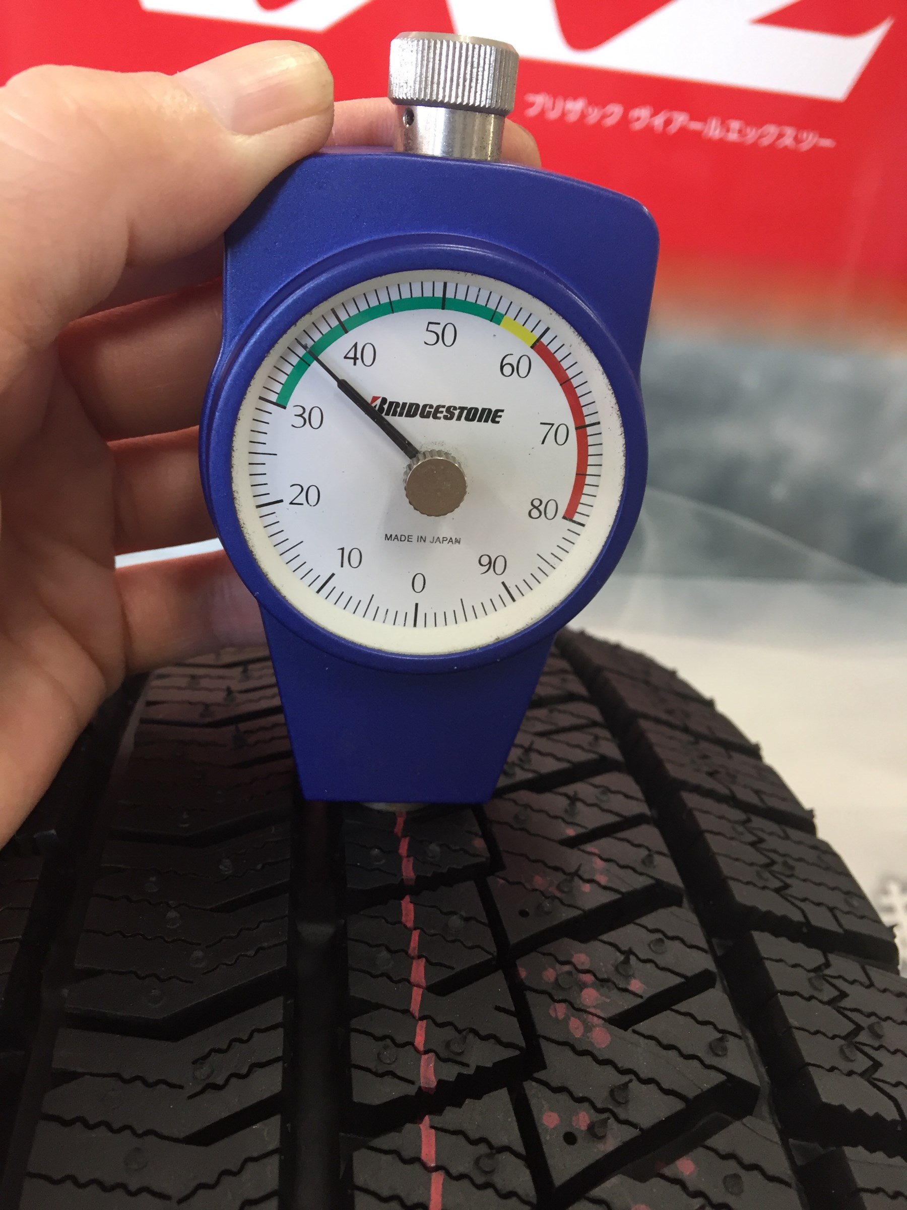 タイヤの硬さ「硬度チェック」 「残溝チェック」を専用器具でしっかりチェックいたします。