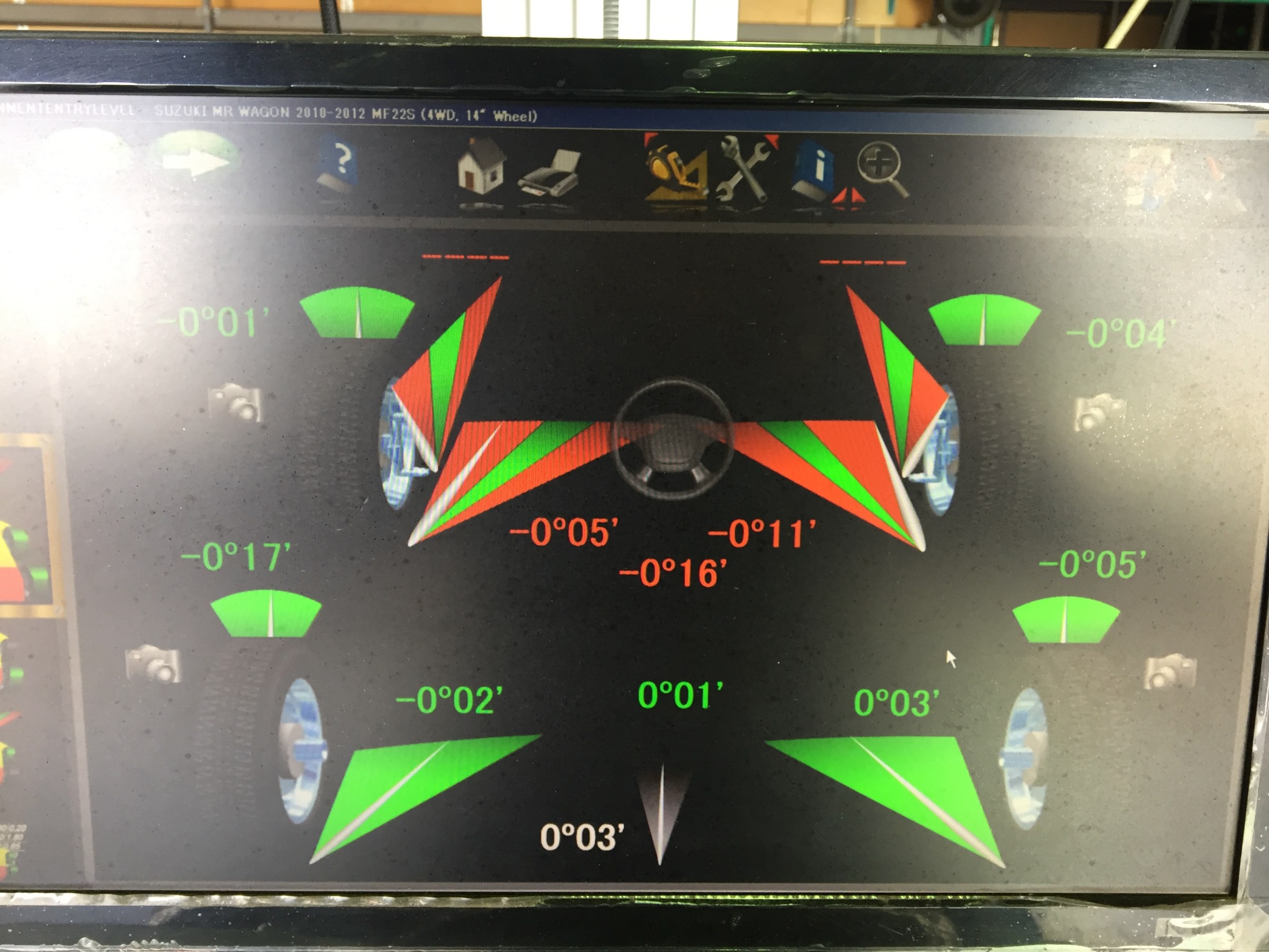 測定画像を見てみると前輪のタイヤのトーがアウトに-0度16分になっていました。