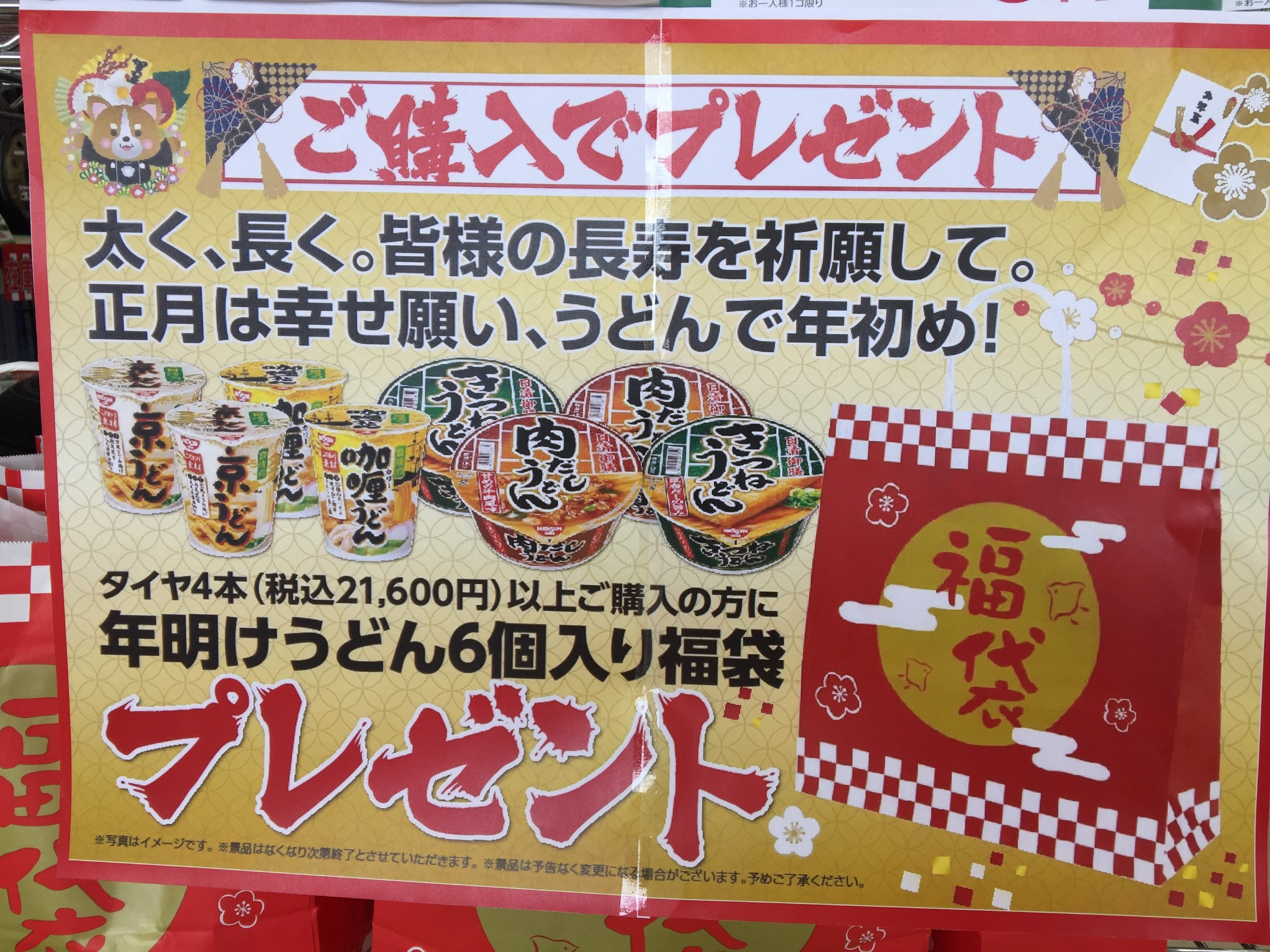 そして、タイヤ4本ご購入の方に「年明けうどん6個入り福袋」をプレゼントしております。