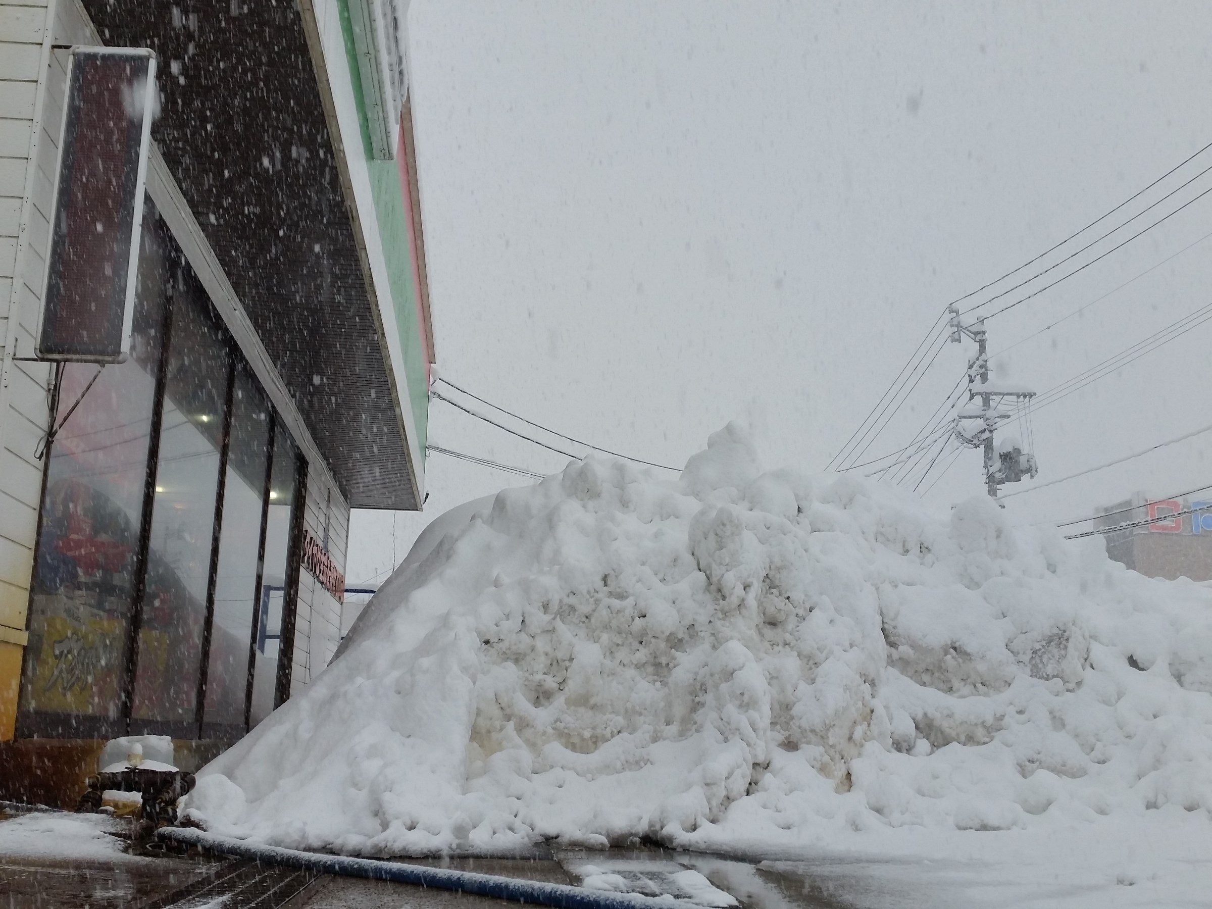 お店の脇に積み上がった雪山は再び3mほどになりました(++)