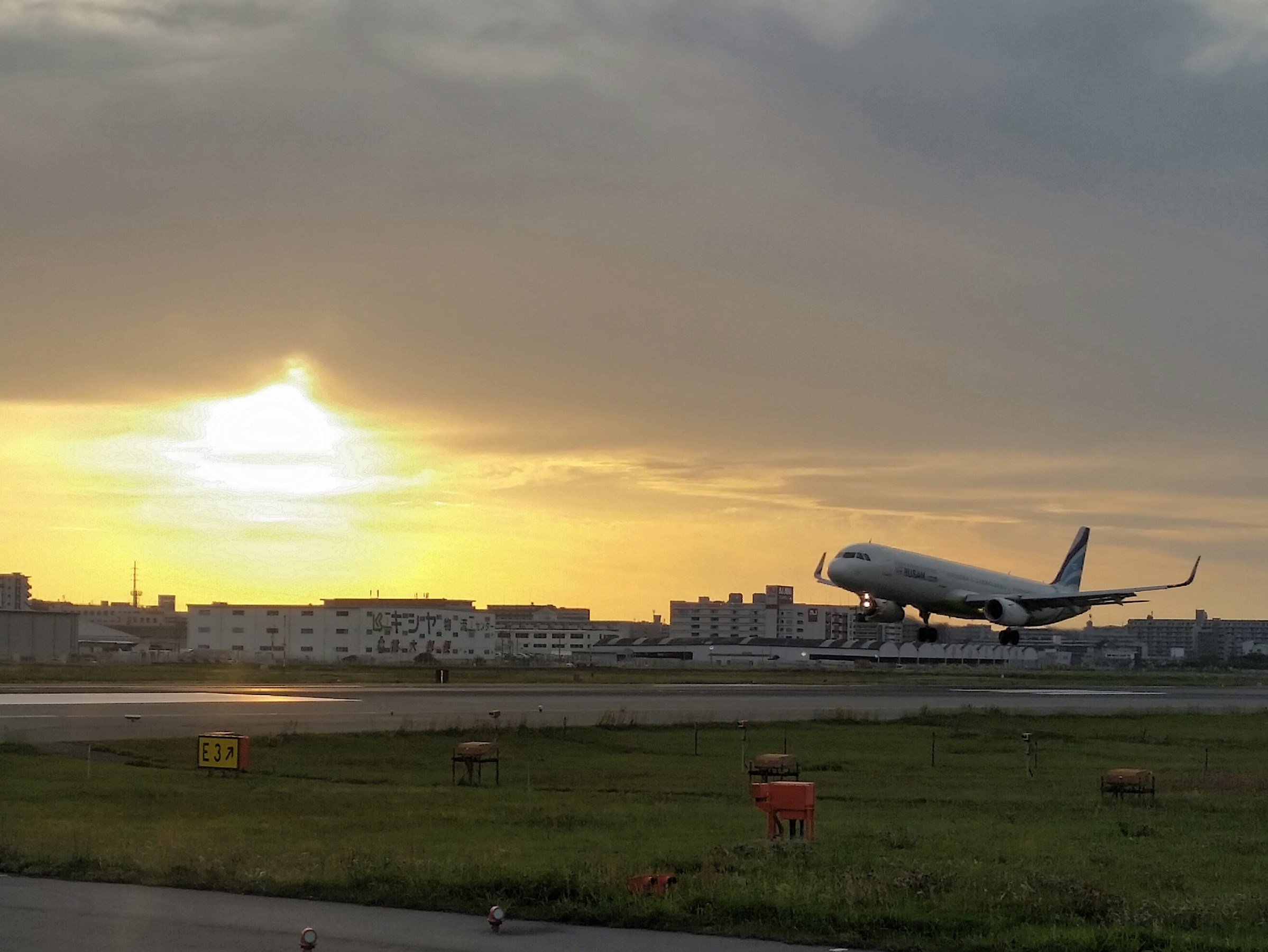 なので九州っぽい写真が全くないのですが、帰りの福岡空港で夕焼けと着陸する飛行機をパシャリ♪
