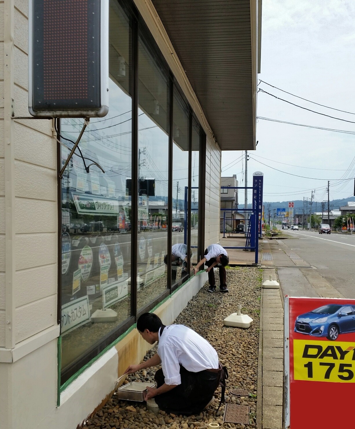 昨日の白線引きに続き、本日も店長が消雪用の水で汚れた建物の基礎部分を塗り塗り。